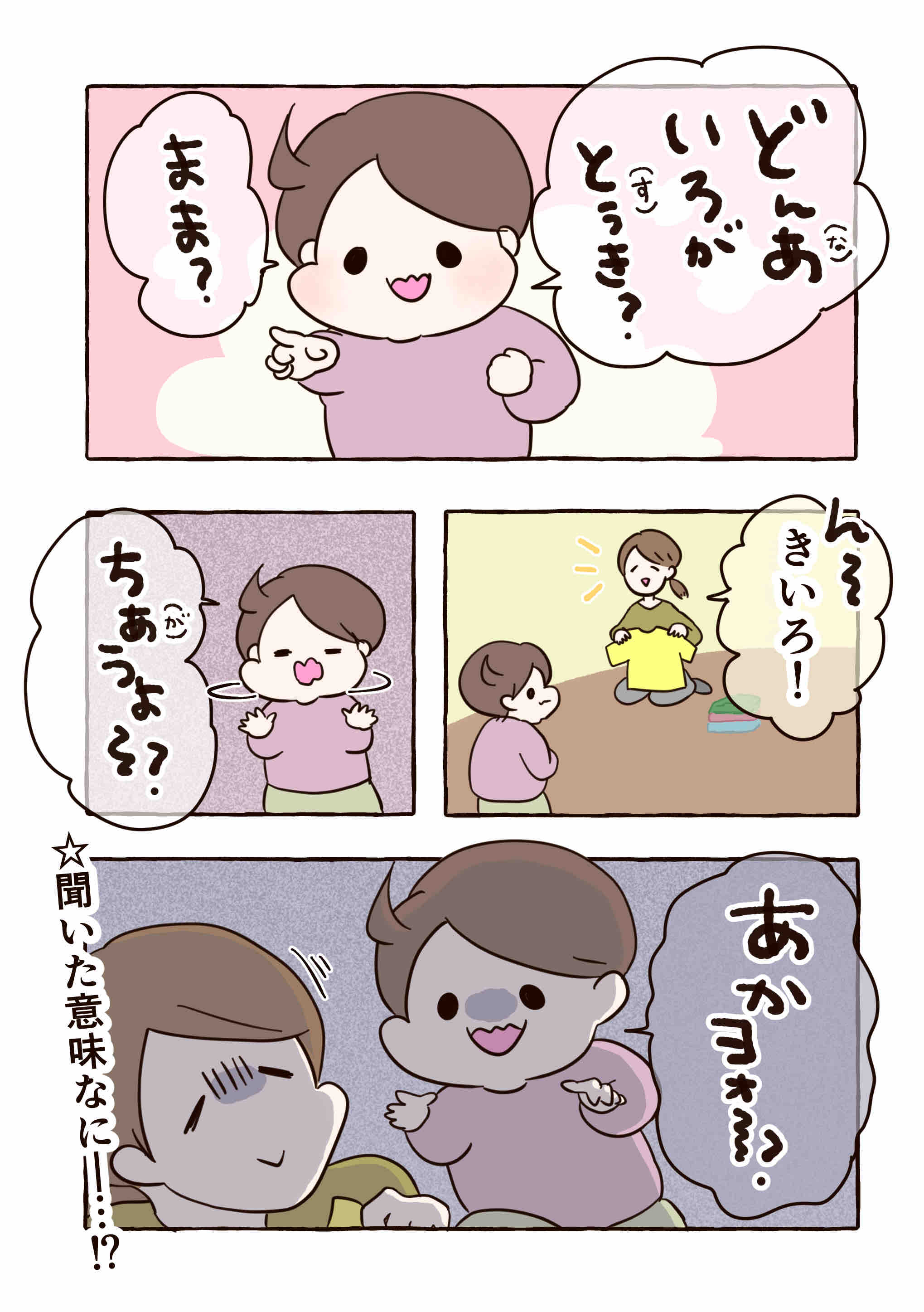 少し前までは赤と青を混同して話していたけど、茶色を黒とか、赤をピンクとかの近しい色を答えるようになったかな?