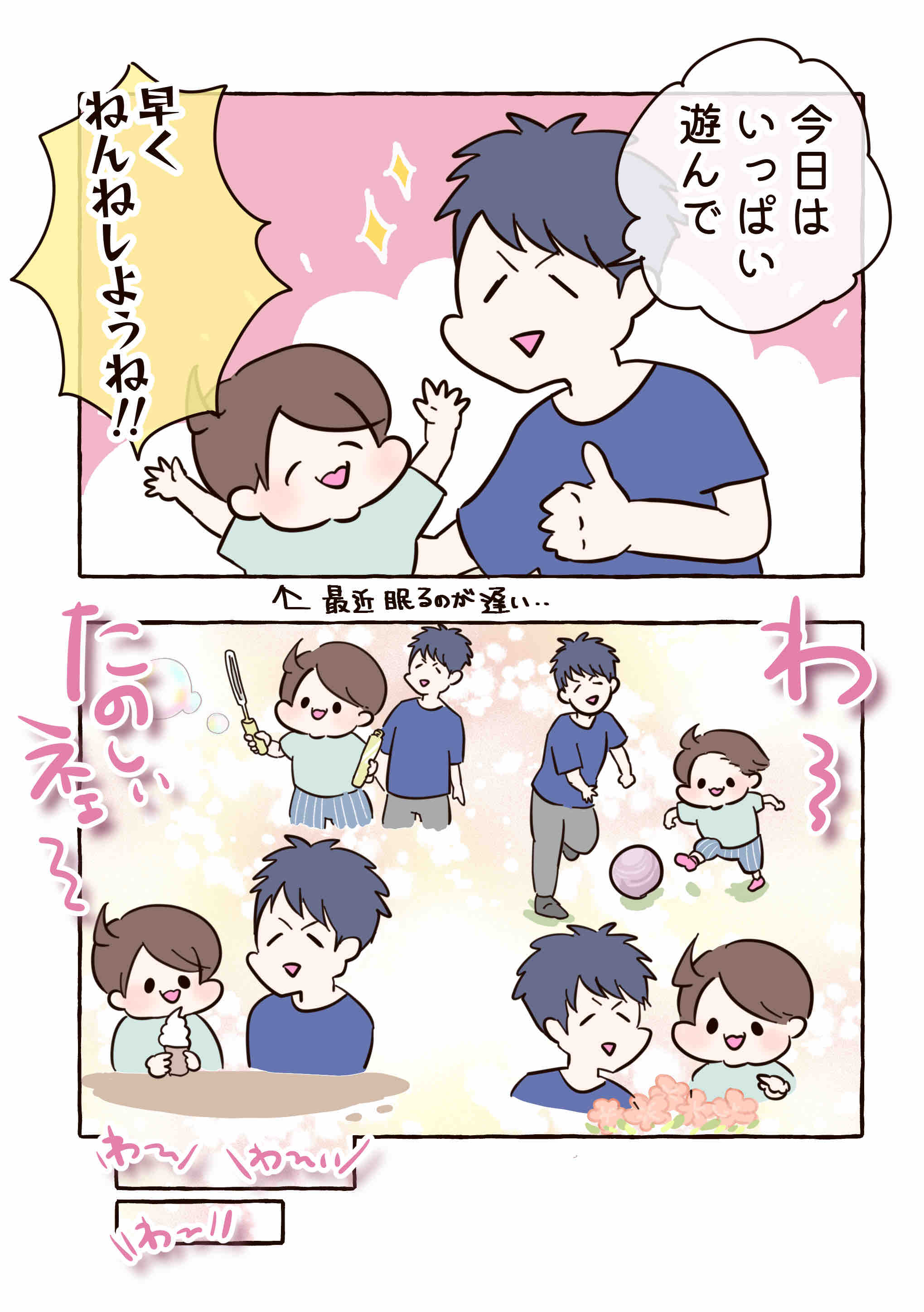 なので早め早めに行動して早く寝かせようとするんですが、夜の寝かしつけ、どうしても1時間以上かかるんですよ………