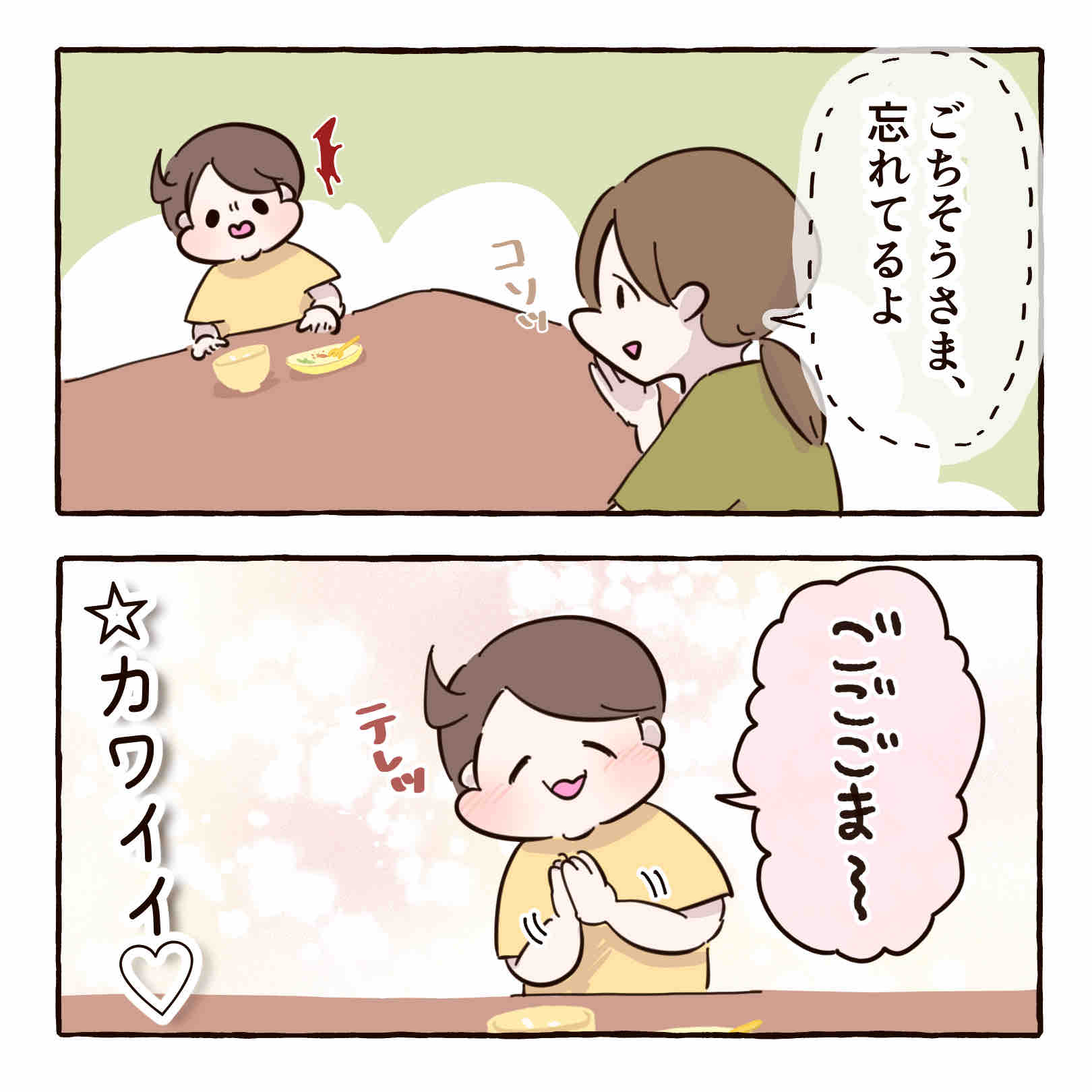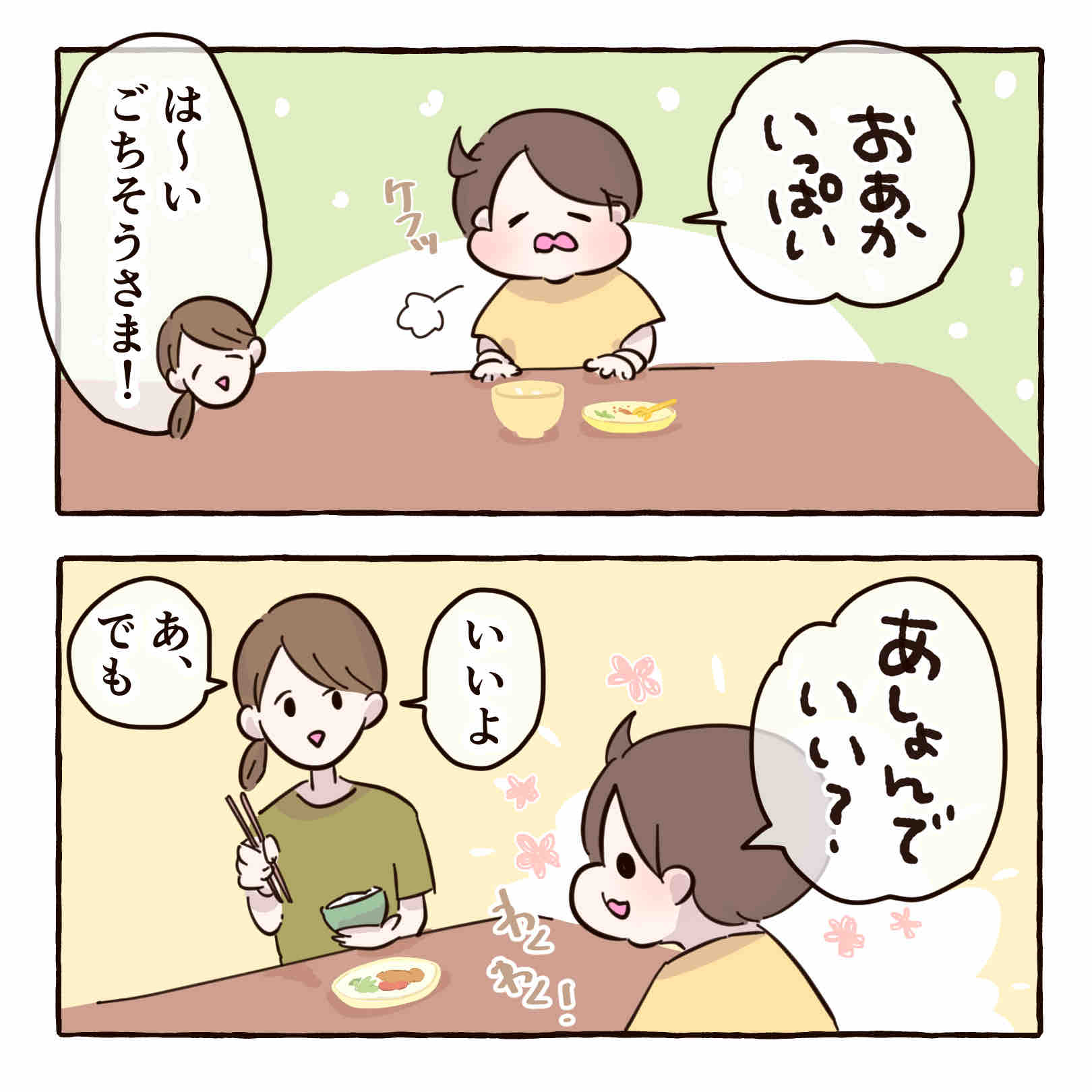 いつか普通にごちそうさまって言うようになるんだろうけど、成長が嬉しいのと、寂しいので感情ごちゃ混ぜになるんだろうな😌