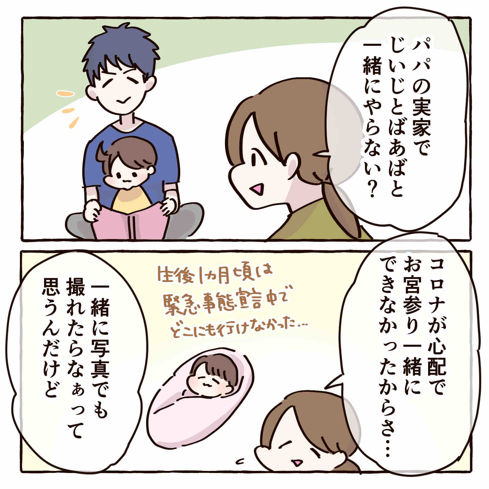 記念写真もそのときに近所のスタジオで撮りましたが…その時に生後1ヶ月頃の赤ちゃんがお宮参りの写真を撮影しにきていて、何だか複雑な気持ちになりましたね。