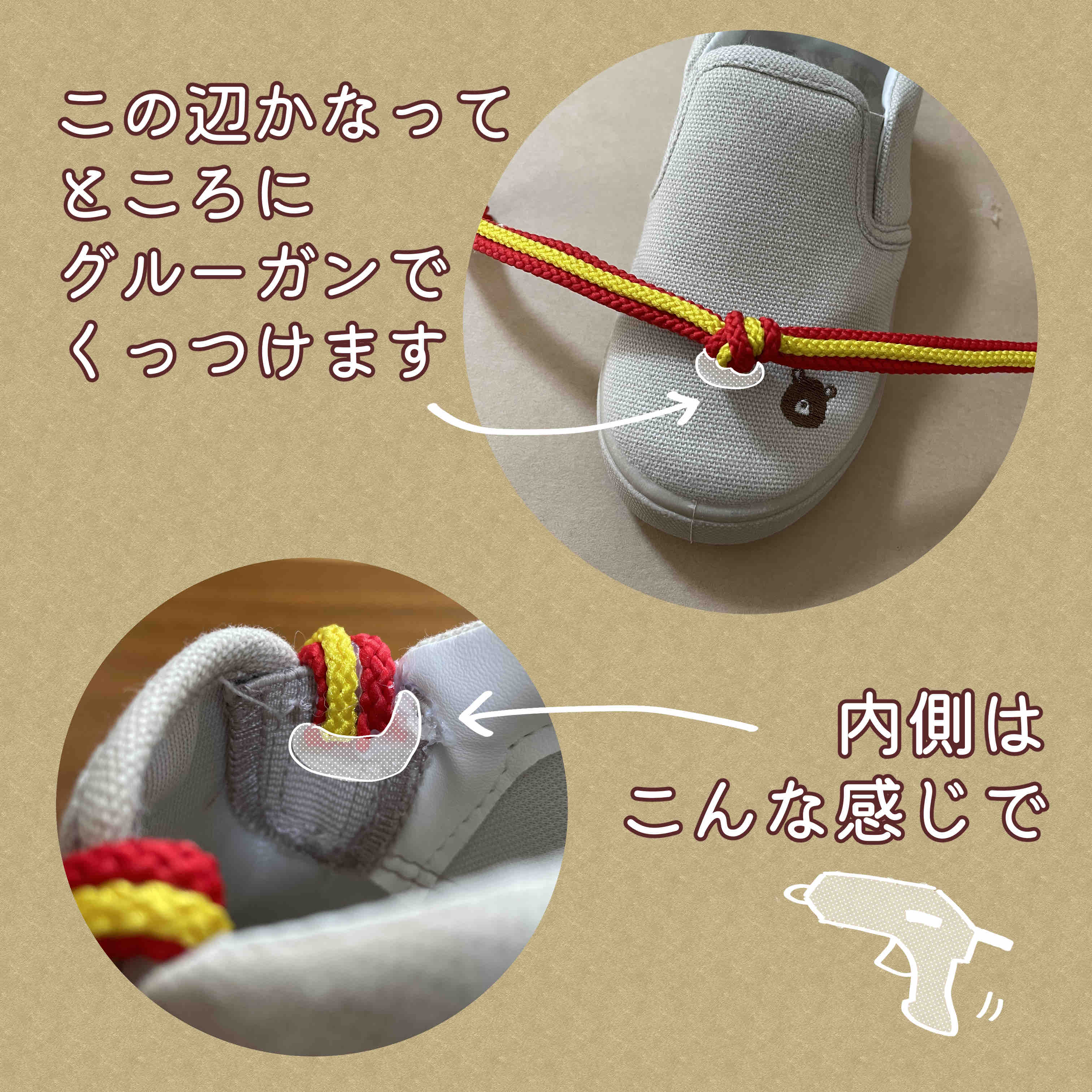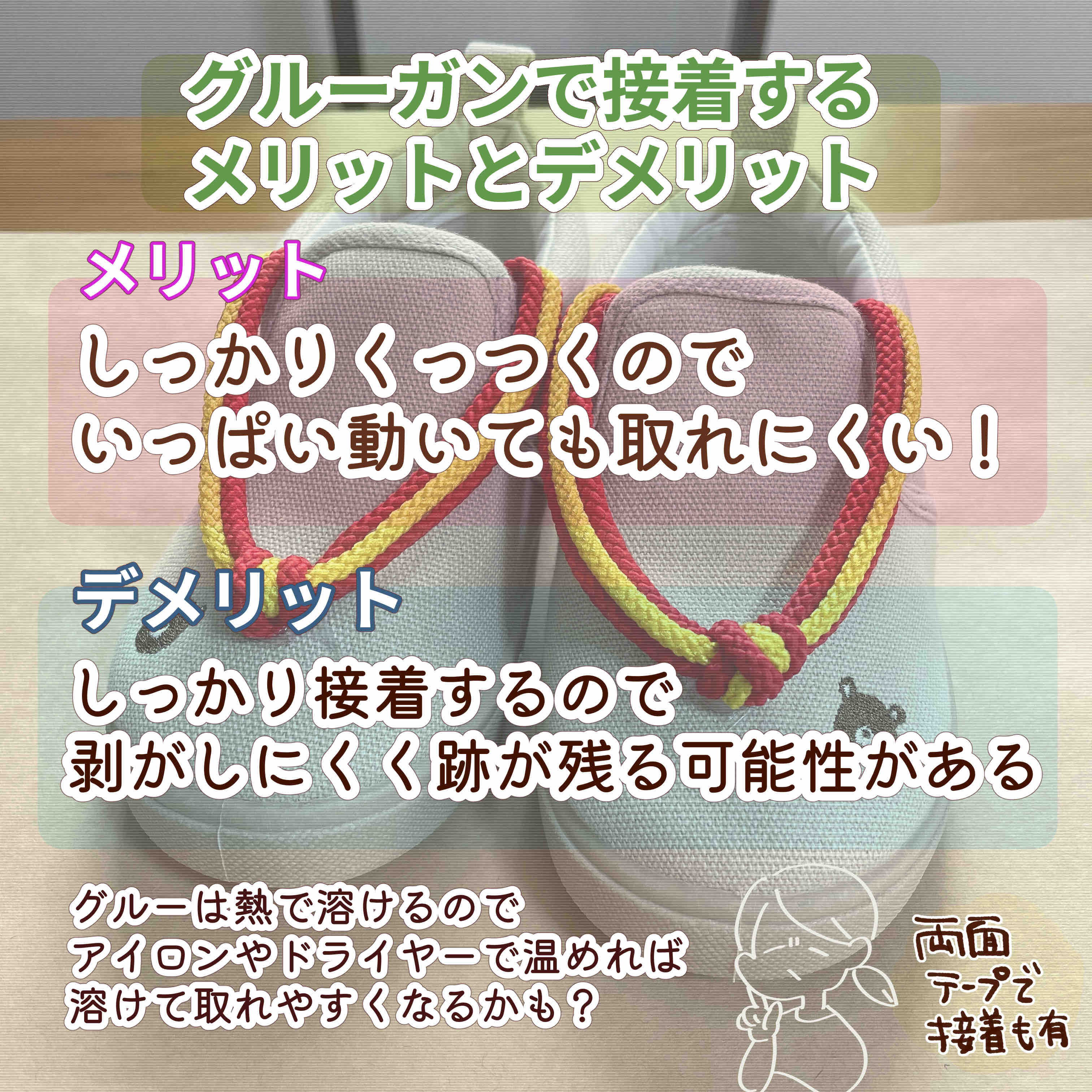 紐を靴の色と近いフェルトなどの布に接着してからフェルトと靴を両面テープで貼り付ける方が取り外しが簡単だと思います。