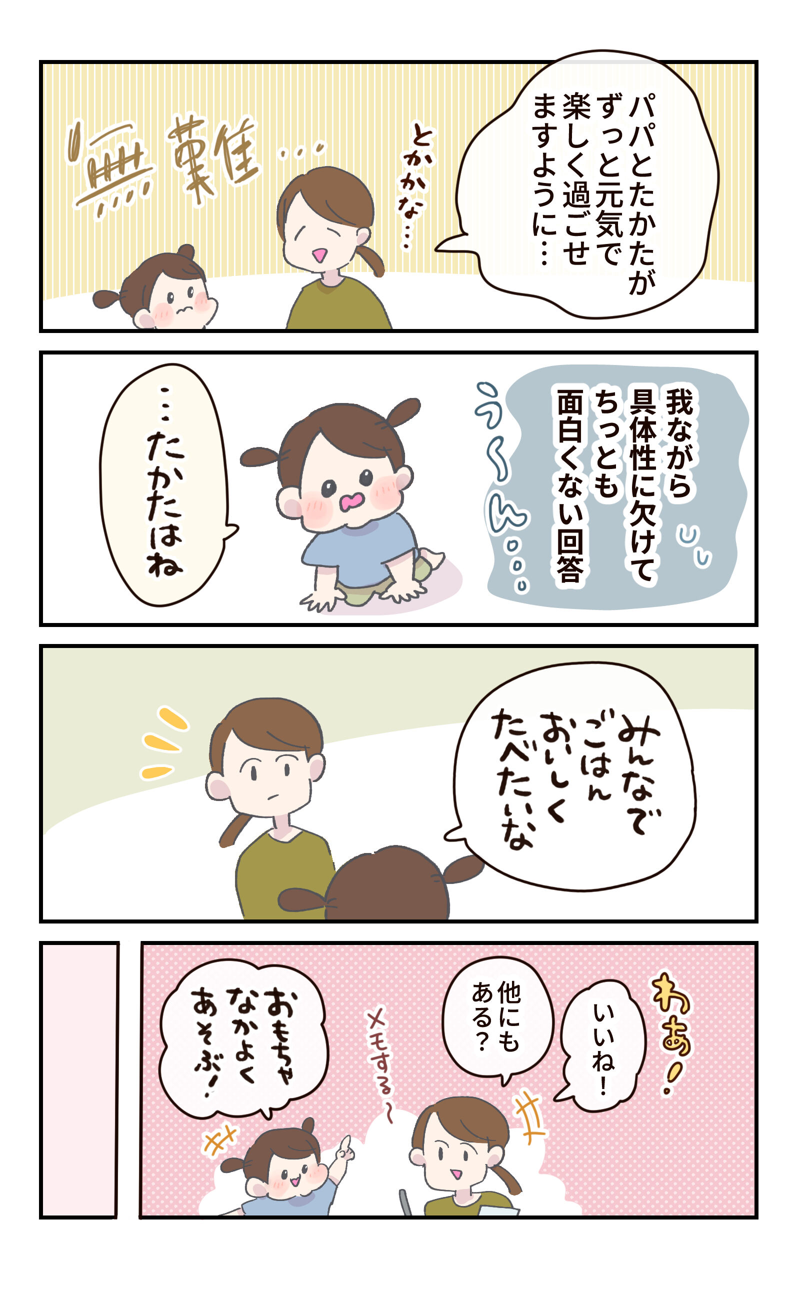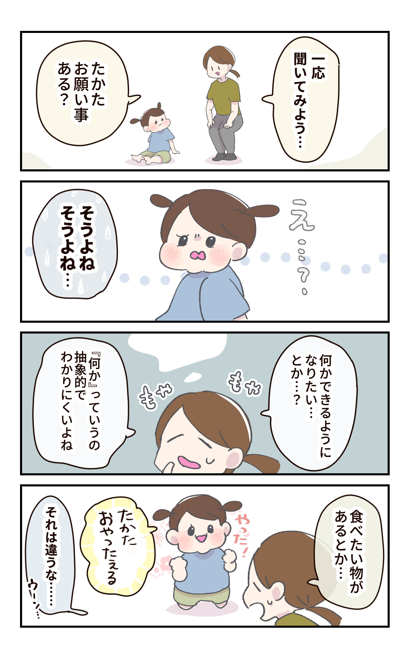 3歳と母、七夕のお願い事を考える 2023.07.04 日常 3歳と母、七夕のお願い事を考える 広告 あとがき えっ…! みんな5兆円欲しいよね!? ▼去年の七夕はこうだった 我が家の七夕(?) ▼これは聞けないお願い 最後のお願いは、本当に最後のお願いか? ▼母の切なる願い まだオムツ外れてないのに検尿だって…!?②【3歳児健診】 ▼今年のひな祭りのご様子 夫にひな祭りのご飯をまかせたら… 0 コメントはこちら 同じカテゴリの記事 ワンテンポ遅い親の気付き おしっこもってくの!? パパのアドバイスを受け止める 連載一覧 寒さ対策 不審者にならないために 赤ちゃんがうなる理由 インフルエンザの予防接種に行ってきた! 5歳の娘の不思議な質問!?【ASOPPA!連載】 毎年恒例のおせちの選び方! 雨の日にお外に行ってはいけないよ 臓器なのにかわいい? 子どもの心臓の音を聞いて親が気づいた大切なこと【ASOPPA!連載】 ヤマトじゃない 夫が北海道に行くらしい 撮ってると思って身構えたのに……主役はまさかの“そっち側”だった【ASOPPA!連載】 初めてのたこ焼き作るよ!【後編】 初めてのたこ焼き作るよ!【前編】 9月になったので年末の準備をはじめる! 園で拾ったピンクの石を交換した娘……ほっこりする話かと思いきや、まさかの展開に母ダッシュ【ASOPPA!連載】 LINEスタンプ、配信開始しました! 自信満々な5さい 祭りの花火、音と煙で怖いかな?泣いちゃうかな……!?【ASOPPA!連載】 「乗ってもいいの?」遠慮する5歳を飛行機ポーズで飛ばしてみたら…【ASOPPA!連載】 おしゃれな本棚を作りたい! ママみて!が止まらない 大人がうんていにチャレンジしたら、肩からすごい音が…【ASOPPA!連載】 たかた、全集中〇〇の型 お菓子警察、もう騙されない ママって魔法使い!?ペットボトルを使った水あそびでサイエンスごっこ【ASOPPA!連載】 セルフまつパにチャレンジしてみた話 ランドセルの話をしてただけなのに……先生の声が少し変わった瞬間のこと【ASOPPA!連載】とお知らせ なんにでも才能を見出しちゃう親 ママのヒントがまさかの罠!?しりとり中に飛び出した言い間違いに思わずにっこり【ASOPPA!連載】 無意識に自分を下げてしまうことがある かわいいすぎてずるいって話と書籍PR 星がふえると、なんだかうれしい!七夕の“飛ばし絵”あそび【ASOPPA!連載】 5さい、指先の皮がボロボロ… からあげってどんな味がする!? 君が生まれたばかりの世界は……5歳の誕生日に感じた子どもの成長【ASOPPA!連載】 わずかなヒントから答えを探し出せ! カレーうどんってどんな味?5歳の素直な感想にパパ思わず感心【ASOPPA!連載】 ダメージ加工ってさ… 「1たす1は11?」5歳児のピュアな計算ミスに母、胸キュン【ASOPPA!連載】 記念すべき?歯が抜けた話【後編】 記念すべき?歯が抜けた話【中編】 記念すべき?歯が抜けた話【前編】 各方面への配慮 懐かしくて、ちょっとしょっぱい。大人になって気づいた、駄菓子とのちょうどいい距離感【ASOPPA!連載】 緊張しいのたかた【後編】七五三の前撮り 緊張しいのたかた【前編】七五三の前撮り ここまでくるのに5年かかりました 生放送でお名前を呼ばれたい 泥団子を極めしもの ピーピー豆とおままごと 「パパだけ保育園に行くね」と言ったら、娘の返答がまさかの本気モードで笑っちゃう!【ASOPPA!連載】 見せたい自信作 ねぇ、あれってなんだっけ? ドレスを選ぶ基準【後編】七五三の前撮り ドレスを選ぶ基準【前編】七五三の前撮り 泣くのって悪いこと?【後編】 泣くのって悪いこと?【前編】 ありがとうじゃなくて……!?5歳にお礼を促した結果に笑っちゃう【ASOPPA!連載】 もう七五三するの!?【後編】 もう七五三するの!?【前編】 パパのおしり拭き おいしいお薬を食べてみた 君が赤ちゃんのときの話 一体何を見つけたの〜!?子どもと過ごす春は発見とハプニングの連続だ!【ASOPPA!連載】 ゆふいんの森号に乗りたい親子 2025春のパン祭り経過 冷蔵庫にゼリーがあるぞ! 「せ」の音はどこ?ピアノで遊ぶ4歳の純粋な疑問にパパ困惑 【ASOPPA!連載】 アマゾンってなに? タブレットに不正アクセスされた話 そろそろ「たかた」を卒業させたい 「まごわやさしい」の「い」はまさかの……!?4歳の自由すぎる発想に思わず笑顔に【ASOPPA!連載】 名前の練習ってどうする?我が家のゆるっと入園準備 【ASOPPA!連載】 ついにこの時がやってきた オンラインフィットネス「サーティフィット」で理想の体を目指す話④ ご報告 私もかわいいの!赤ちゃん時代の写真を見た4歳児の反応にほっこり【ASOPPA!連載】 今年もパン祭りがはじまった お散歩が楽しみすぎる4歳!着替えながらお片付け……できちゃうの!?【ASOPPA!連載】 4歳、歯科がこわい ほぼ売れ切れのご飯屋さんの正体 いつものおやつを特別にする?とびきりの裏技 かわいい4歳の指を借りて……バレンタインのかわいいお菓子を一緒に手作り【ASOPPA!連載】 オンラインフィットネス「サーティフィット」で理想の体を目指す話③ 断られても気にしないメンタル 疲れた母をどうにかする4才 手に余