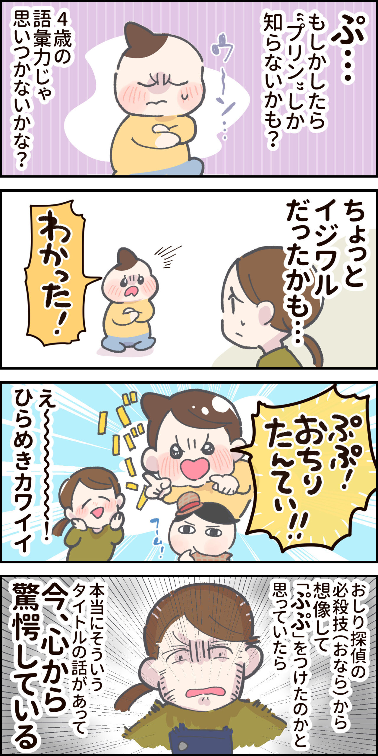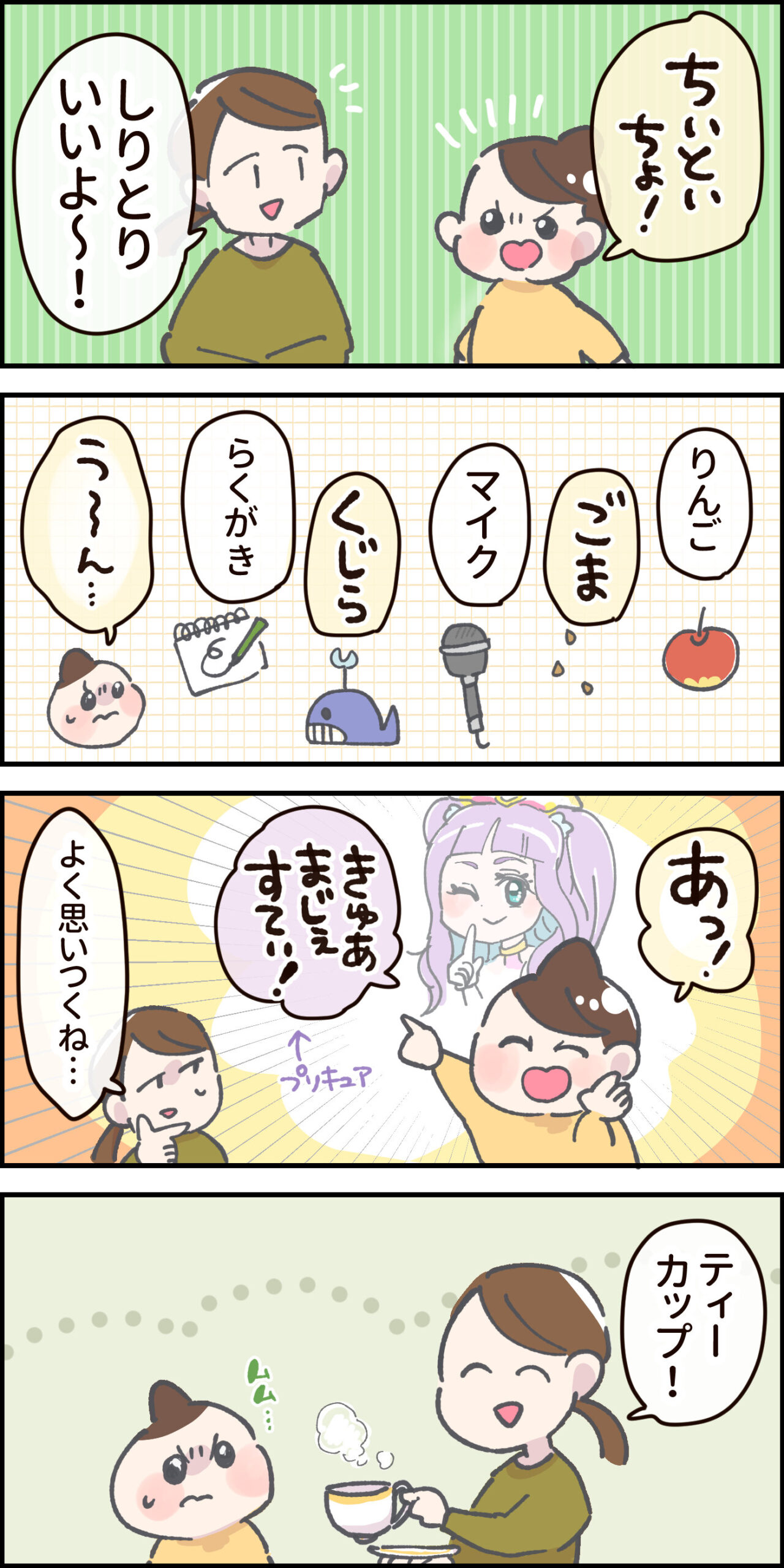 4歳と遊ぶしりとり、加減が難しい 2024.04.12 日常 4歳と遊ぶしりとり、加減が難しい と言ったものの… あとがき さすがに知らないかと思うけど もし知ってて答えたなら 記憶力がすごすぎる 変な遊びを生み出す天才 お風呂での過ごし方があまりにも違いすぎた夫婦 3さい、大人が雪を怖がるのを不思議に思ってる話 ところでしりとりってこんなに 難しい遊びだったんですね…! 子どもが知ってそうな単語縛りだから すっごい!難しい…!!! 0 コメントはこちら 同じカテゴリの記事 ワンテンポ遅い親の気付き おしっこもってくの!? パパのアドバイスを受け止める 連載一覧 寒さ対策 不審者にならないために 赤ちゃんがうなる理由 インフルエンザの予防接種に行ってきた! 5歳の娘の不思議な質問!?【ASOPPA!連載】 毎年恒例のおせちの選び方! 雨の日にお外に行ってはいけないよ 臓器なのにかわいい? 子どもの心臓の音を聞いて親が気づいた大切なこと【ASOPPA!連載】 ヤマトじゃない 夫が北海道に行くらしい 撮ってると思って身構えたのに……主役はまさかの“そっち側”だった【ASOPPA!連載】 初めてのたこ焼き作るよ!【後編】 初めてのたこ焼き作るよ!【前編】 9月になったので年末の準備をはじめる! 園で拾ったピンクの石を交換した娘……ほっこりする話かと思いきや、まさかの展開に母ダッシュ【ASOPPA!連載】 LINEスタンプ、配信開始しました! 自信満々な5さい 祭りの花火、音と煙で怖いかな?泣いちゃうかな……!?【ASOPPA!連載】 「乗ってもいいの?」遠慮する5歳を飛行機ポーズで飛ばしてみたら…【ASOPPA!連載】 おしゃれな本棚を作りたい! ママみて!が止まらない 大人がうんていにチャレンジしたら、肩からすごい音が…【ASOPPA!連載】 たかた、全集中〇〇の型 お菓子警察、もう騙されない ママって魔法使い!?ペットボトルを使った水あそびでサイエンスごっこ【ASOPPA!連載】 セルフまつパにチャレンジしてみた話 ランドセルの話をしてただけなのに……先生の声が少し変わった瞬間のこと【ASOPPA!連載】とお知らせ なんにでも才能を見出しちゃう親 ママのヒントがまさかの罠!?しりとり中に飛び出した言い間違いに思わずにっこり【ASOPPA!連載】 無意識に自分を下げてしまうことがある かわいいすぎてずるいって話と書籍PR 星がふえると、なんだかうれしい!七夕の“飛ばし絵”あそび【ASOPPA!連載】 5さい、指先の皮がボロボロ… からあげってどんな味がする!? 君が生まれたばかりの世界は……5歳の誕生日に感じた子どもの成長【ASOPPA!連載】 わずかなヒントから答えを探し出せ! カレーうどんってどんな味?5歳の素直な感想にパパ思わず感心【ASOPPA!連載】 ダメージ加工ってさ… 「1たす1は11?」5歳児のピュアな計算ミスに母、胸キュン【ASOPPA!連載】 記念すべき?歯が抜けた話【後編】 記念すべき?歯が抜けた話【中編】 記念すべき?歯が抜けた話【前編】 各方面への配慮 懐かしくて、ちょっとしょっぱい。大人になって気づいた、駄菓子とのちょうどいい距離感【ASOPPA!連載】 緊張しいのたかた【後編】七五三の前撮り 緊張しいのたかた【前編】七五三の前撮り ここまでくるのに5年かかりました 生放送でお名前を呼ばれたい 泥団子を極めしもの ピーピー豆とおままごと 「パパだけ保育園に行くね」と言ったら、娘の返答がまさかの本気モードで笑っちゃう!【ASOPPA!連載】 見せたい自信作 ねぇ、あれってなんだっけ? ドレスを選ぶ基準【後編】七五三の前撮り ドレスを選ぶ基準【前編】七五三の前撮り 泣くのって悪いこと?【後編】 泣くのって悪いこと?【前編】 ありがとうじゃなくて……!?5歳にお礼を促した結果に笑っちゃう【ASOPPA!連載】 もう七五三するの!?【後編】 もう七五三するの!?【前編】 パパのおしり拭き おいしいお薬を食べてみた 君が赤ちゃんのときの話 一体何を見つけたの〜!?子どもと過ごす春は発見とハプニングの連続だ!【ASOPPA!連載】 ゆふいんの森号に乗りたい親子 2025春のパン祭り経過 冷蔵庫にゼリーがあるぞ! 「せ」の音はどこ?ピアノで遊ぶ4歳の純粋な疑問にパパ困惑 【ASOPPA!連載】 アマゾンってなに? タブレットに不正アクセスされた話 そろそろ「たかた」を卒業させたい 「まごわやさしい」の「い」はまさかの……!?4歳の自由すぎる発想に思わず笑顔に【ASOPPA!連載】 名前の練習ってどうする?我が家のゆるっと入園準備 【ASOPPA!連載】 ついにこの時がやってきた オンラインフィットネス「サーティフィット」で理想の体を目指す話④ ご報告 私もかわいいの!赤ちゃん時代の写真を見た4歳児の反応にほっこり【ASOPPA!連載】 今年もパン祭りがはじまった お散歩が楽しみすぎる4歳!着替えながらお片付け……できちゃうの!?【ASOPPA!連載】 4歳、歯科がこわい ほぼ売れ切れのご飯屋さんの正体 いつものおやつを特別にする?とびきりの裏技 かわいい4歳の指を借りて……バレンタインのかわいいお菓子を一緒に手作り【ASOPPA!連載】 オンラインフィットネス「サーティフィット」で理想の体を目指す話③ 断られても気