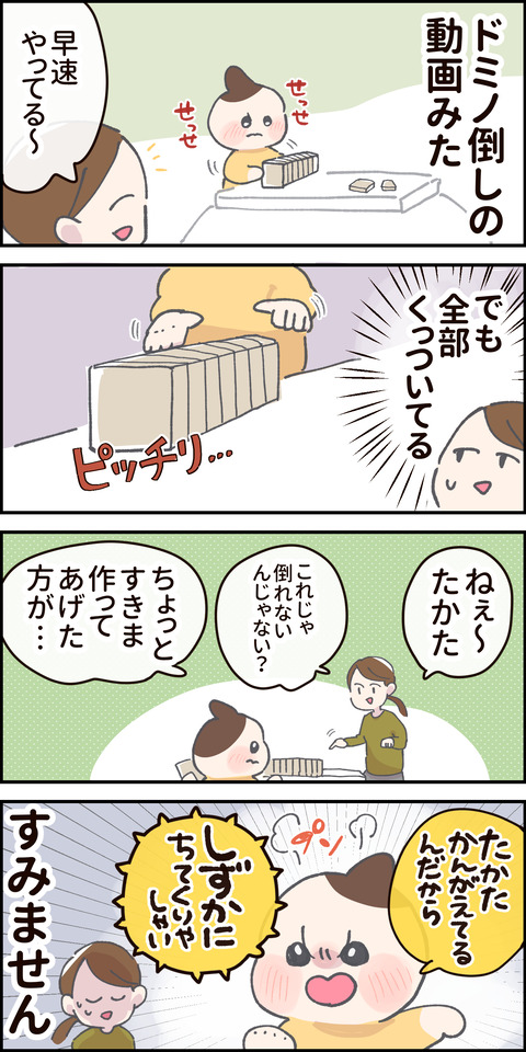 <blockquote class="wp-embedded-content" data-secret="OisB7ZsiGl"><a href="https://takimotokiwi.napbizblog.jp/archives/27626920.html">4歳とドミノ倒しとお節介な母</a></blockquote><iframe sandbox="allow-scripts" security="restricted" src="https://takimotokiwi.napbizblog.jp/archives/27626920.html/embed#?secret=OisB7ZsiGl" width="600" height="400" title="“4歳とドミノ倒しとお節介な母” — たきもとキウイの毎日ふりまわされてます" data-secret="OisB7ZsiGl" frameborder="0" marginwidth="0" marginheight="0" scrolling="no" class="wp-embedded-content"></iframe><script type="text/javascript"> /* <![CDATA[ */ /*! This file is auto-generated */ !function(d,l){"use strict";l.querySelector&&d.addEventListener&&"undefined"!=typeof URL&&(d.wp=d.wp||{},d.wp.receiveEmbedMessage||(d.wp.receiveEmbedMessage=function(e){var t=e.data;if((t||t.secret||t.message||t.value)&&!/[^a-zA-Z0-9]/.test(t.secret)){for(var s,r,n,a=l.querySelectorAll('iframe[data-secret="'+t.secret+'"]'),o=l.querySelectorAll('blockquote[data-secret="'+t.secret+'"]'),c=new RegExp("^https?:$","i"),i=0;i<o.length;i++)o[i].style.display="none";for(i=0;i<a.length;i++)s=a[i],e.source===s.contentWindow&&(s.removeAttribute("style"),"height"===t.message?(1e3<(r=parseInt(t.value,10))?r=1e3:~~r<200&&(r=200),s.height=r):"link"===t.message&&(r=new URL(s.getAttribute("src")),n=new URL(t.value),c.test(n.protocol))&&n.host===r.host&&l.activeElement===s&&(d.top.location.href=t.value))}},d.addEventListener("message",d.wp.receiveEmbedMessage,!1),l.addEventListener("DOMContentLoaded",function(){for(var e,t,s=l.querySelectorAll("iframe.wp-embedded-content"),r=0;r<s.length;r++)(t=(e=s[r]).getAttribute("data-secret"))||(t=Math.random().toString(36).substring(2,12),e.src+="#?secret="+t,e.setAttribute("data-secret",t)),e.contentWindow.postMessage({message:"ready",secret:t},"*")},!1)))}(window,document); //# sourceURL=https://takimotokiwi.napbizblog.jp/wp-includes/js/wp-embed.min.js /* ]]> */ </script>
