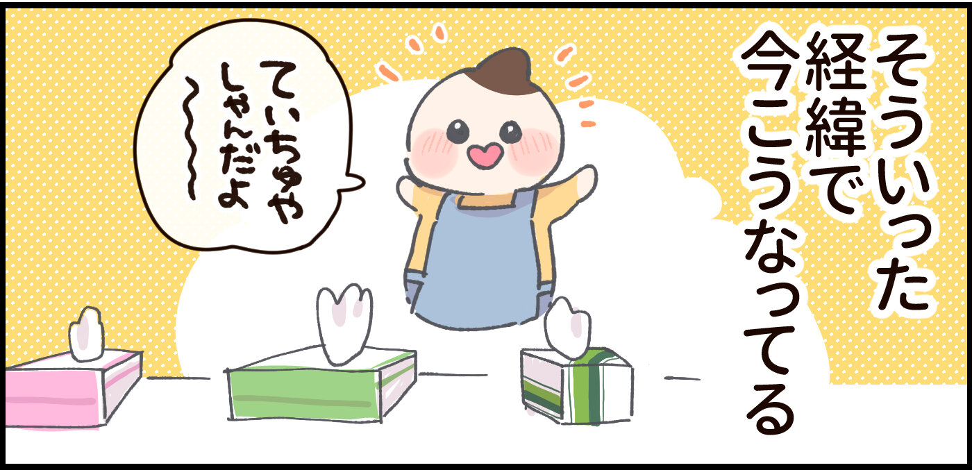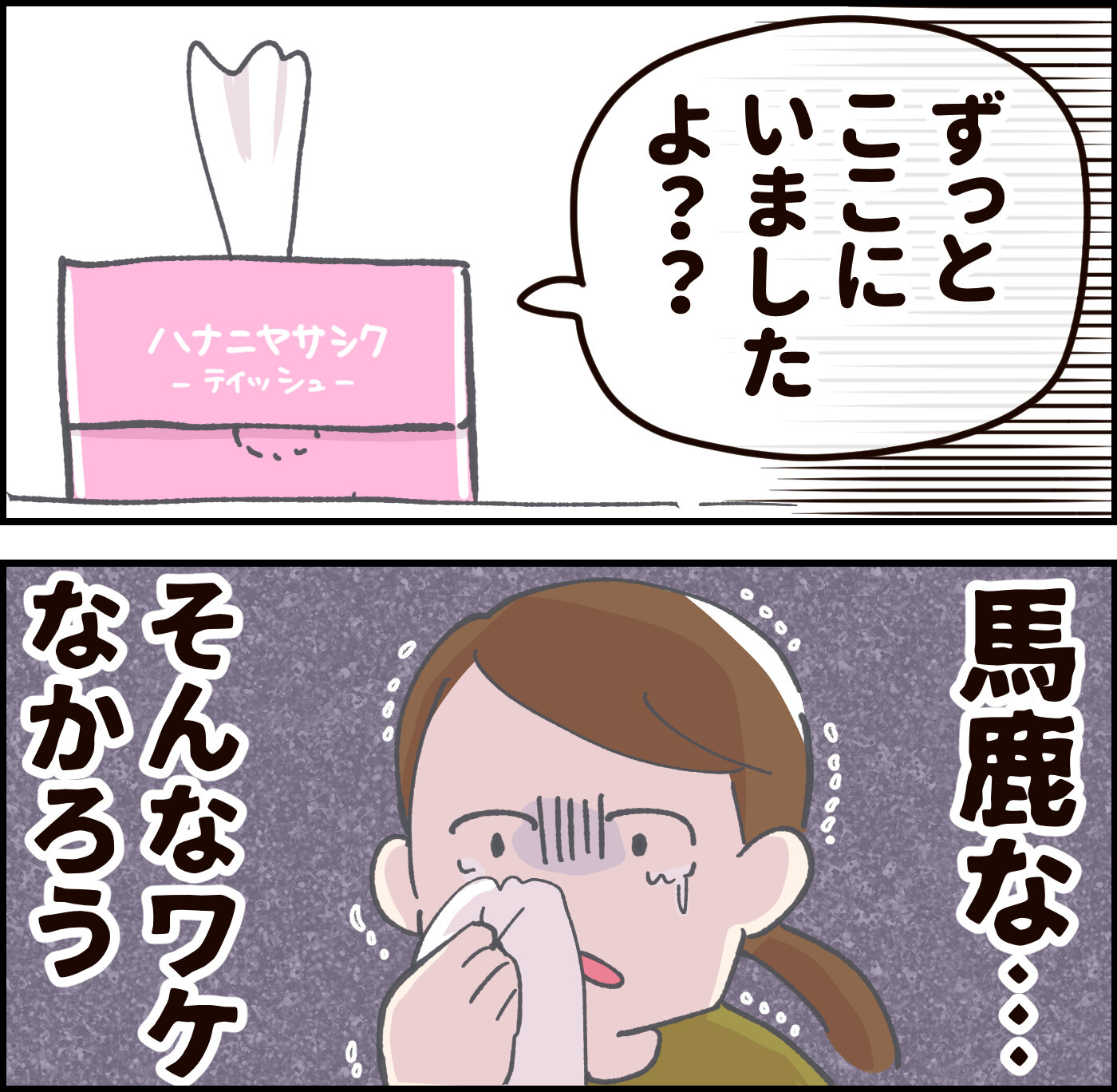 消えるティッシュ 2024.04.23 日常 消えるティッシュ あとがき は? は??? ドウシテ…ドウシテ…… 時の流れについていけない おせちの重箱を何かに使いたい私と夫の話 おまけ この時期は毎年なんだけど 鼻炎で苦しんでる ツラい…ツラいよぉ…… 0 コメントはこちら 同じカテゴリの記事 ワンテンポ遅い親の気付き おしっこもってくの!? パパのアドバイスを受け止める 連載一覧 寒さ対策 不審者にならないために 赤ちゃんがうなる理由 インフルエンザの予防接種に行ってきた! 5歳の娘の不思議な質問!?【ASOPPA!連載】 毎年恒例のおせちの選び方! 雨の日にお外に行ってはいけないよ 臓器なのにかわいい? 子どもの心臓の音を聞いて親が気づいた大切なこと【ASOPPA!連載】 ヤマトじゃない 夫が北海道に行くらしい 撮ってると思って身構えたのに……主役はまさかの“そっち側”だった【ASOPPA!連載】 初めてのたこ焼き作るよ!【後編】 初めてのたこ焼き作るよ!【前編】 9月になったので年末の準備をはじめる! 園で拾ったピンクの石を交換した娘……ほっこりする話かと思いきや、まさかの展開に母ダッシュ【ASOPPA!連載】 LINEスタンプ、配信開始しました! 自信満々な5さい 祭りの花火、音と煙で怖いかな?泣いちゃうかな……!?【ASOPPA!連載】 「乗ってもいいの?」遠慮する5歳を飛行機ポーズで飛ばしてみたら…【ASOPPA!連載】 おしゃれな本棚を作りたい! ママみて!が止まらない 大人がうんていにチャレンジしたら、肩からすごい音が…【ASOPPA!連載】 たかた、全集中〇〇の型 お菓子警察、もう騙されない ママって魔法使い!?ペットボトルを使った水あそびでサイエンスごっこ【ASOPPA!連載】 セルフまつパにチャレンジしてみた話 ランドセルの話をしてただけなのに……先生の声が少し変わった瞬間のこと【ASOPPA!連載】とお知らせ なんにでも才能を見出しちゃう親 ママのヒントがまさかの罠!?しりとり中に飛び出した言い間違いに思わずにっこり【ASOPPA!連載】 無意識に自分を下げてしまうことがある かわいいすぎてずるいって話と書籍PR 星がふえると、なんだかうれしい!七夕の“飛ばし絵”あそび【ASOPPA!連載】 5さい、指先の皮がボロボロ… からあげってどんな味がする!? 君が生まれたばかりの世界は……5歳の誕生日に感じた子どもの成長【ASOPPA!連載】 わずかなヒントから答えを探し出せ! カレーうどんってどんな味?5歳の素直な感想にパパ思わず感心【ASOPPA!連載】 ダメージ加工ってさ… 「1たす1は11?」5歳児のピュアな計算ミスに母、胸キュン【ASOPPA!連載】 記念すべき?歯が抜けた話【後編】 記念すべき?歯が抜けた話【中編】 記念すべき?歯が抜けた話【前編】 各方面への配慮 懐かしくて、ちょっとしょっぱい。大人になって気づいた、駄菓子とのちょうどいい距離感【ASOPPA!連載】 緊張しいのたかた【後編】七五三の前撮り 緊張しいのたかた【前編】七五三の前撮り ここまでくるのに5年かかりました 生放送でお名前を呼ばれたい 泥団子を極めしもの ピーピー豆とおままごと 「パパだけ保育園に行くね」と言ったら、娘の返答がまさかの本気モードで笑っちゃう!【ASOPPA!連載】 見せたい自信作 ねぇ、あれってなんだっけ? ドレスを選ぶ基準【後編】七五三の前撮り ドレスを選ぶ基準【前編】七五三の前撮り 泣くのって悪いこと?【後編】 泣くのって悪いこと?【前編】 ありがとうじゃなくて……!?5歳にお礼を促した結果に笑っちゃう【ASOPPA!連載】 もう七五三するの!?【後編】 もう七五三するの!?【前編】 パパのおしり拭き おいしいお薬を食べてみた 君が赤ちゃんのときの話 一体何を見つけたの〜!?子どもと過ごす春は発見とハプニングの連続だ!【ASOPPA!連載】 ゆふいんの森号に乗りたい親子 2025春のパン祭り経過 冷蔵庫にゼリーがあるぞ! 「せ」の音はどこ?ピアノで遊ぶ4歳の純粋な疑問にパパ困惑 【ASOPPA!連載】 アマゾンってなに? タブレットに不正アクセスされた話 そろそろ「たかた」を卒業させたい 「まごわやさしい」の「い」はまさかの……!?4歳の自由すぎる発想に思わず笑顔に【ASOPPA!連載】 名前の練習ってどうする?我が家のゆるっと入園準備 【ASOPPA!連載】 ついにこの時がやってきた オンラインフィットネス「サーティフィット」で理想の体を目指す話④ ご報告 私もかわいいの!赤ちゃん時代の写真を見た4歳児の反応にほっこり【ASOPPA!連載】 今年もパン祭りがはじまった お散歩が楽しみすぎる4歳!着替えながらお片付け……できちゃうの!?【ASOPPA!連載】 4歳、歯科がこわい ほぼ売れ切れのご飯屋さんの正体 いつものおやつを特別にする?とびきりの裏技 かわいい4歳の指を借りて……バレンタインのかわいいお菓子を一緒に手作り【ASOPPA!連載】 オンラインフィットネス「サーティフィット」で理想の体を目指す話③ 断られても気にしないメンタル 疲れた母をどうにかする4才 手に余ったクリームを… 体調が悪くなると変な想像するよね? 2025年節分 我が家にあらわれたオニ(4歳) パパ、だいすきだからここをあけてよ パパ