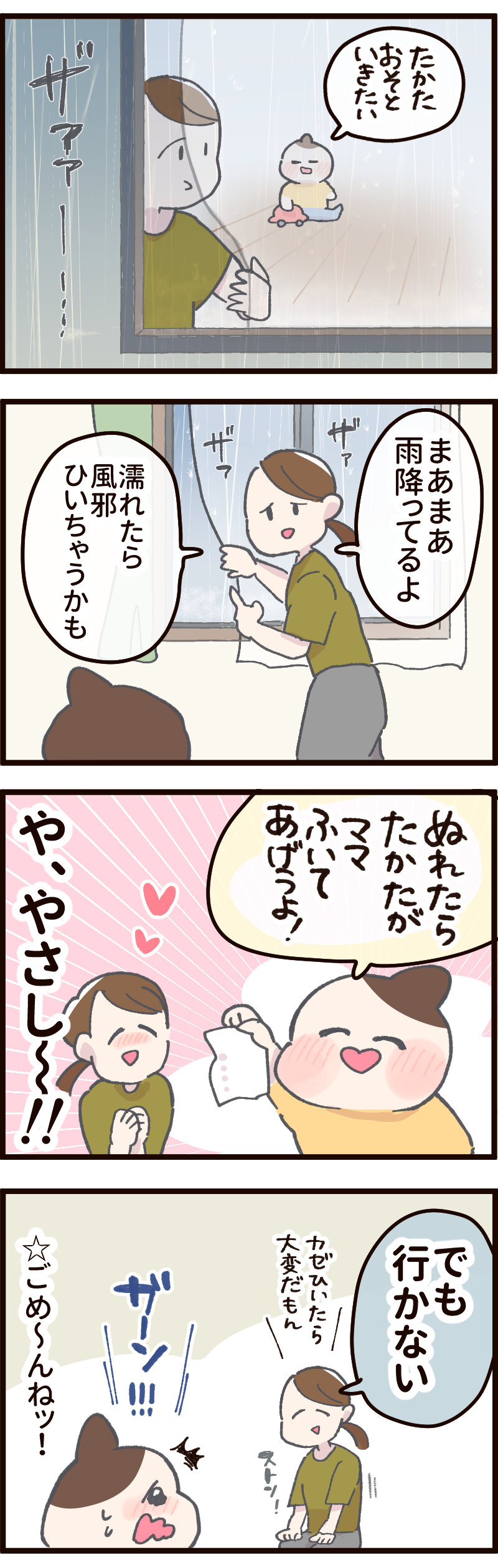 雨が降っててもお出かけしたい 2024.07.01 日常 雨が降っててもお出かけしたい あとがき お外へ出たい気持ちは 尊重してあげたいけど 雨の日はお家にいたいなぁ しつこい風邪からの復活!【風邪①】 3さいと雨の日の動物園に行こう!① 雨の日出かけたくな〜いッ! 0 コメントはこちら 同じカテゴリの記事 ワンテンポ遅い親の気付き おしっこもってくの!? パパのアドバイスを受け止める 連載一覧 寒さ対策 不審者にならないために 赤ちゃんがうなる理由 インフルエンザの予防接種に行ってきた! 5歳の娘の不思議な質問!?【ASOPPA!連載】 毎年恒例のおせちの選び方! 雨の日にお外に行ってはいけないよ 臓器なのにかわいい? 子どもの心臓の音を聞いて親が気づいた大切なこと【ASOPPA!連載】 ヤマトじゃない 夫が北海道に行くらしい 撮ってると思って身構えたのに……主役はまさかの“そっち側”だった【ASOPPA!連載】 初めてのたこ焼き作るよ!【後編】 初めてのたこ焼き作るよ!【前編】 9月になったので年末の準備をはじめる! 園で拾ったピンクの石を交換した娘……ほっこりする話かと思いきや、まさかの展開に母ダッシュ【ASOPPA!連載】 LINEスタンプ、配信開始しました! 自信満々な5さい 祭りの花火、音と煙で怖いかな?泣いちゃうかな……!?【ASOPPA!連載】 「乗ってもいいの?」遠慮する5歳を飛行機ポーズで飛ばしてみたら…【ASOPPA!連載】 おしゃれな本棚を作りたい! ママみて!が止まらない 大人がうんていにチャレンジしたら、肩からすごい音が…【ASOPPA!連載】 たかた、全集中〇〇の型 お菓子警察、もう騙されない ママって魔法使い!?ペットボトルを使った水あそびでサイエンスごっこ【ASOPPA!連載】 セルフまつパにチャレンジしてみた話 ランドセルの話をしてただけなのに……先生の声が少し変わった瞬間のこと【ASOPPA!連載】とお知らせ なんにでも才能を見出しちゃう親 ママのヒントがまさかの罠!?しりとり中に飛び出した言い間違いに思わずにっこり【ASOPPA!連載】 無意識に自分を下げてしまうことがある かわいいすぎてずるいって話と書籍PR 星がふえると、なんだかうれしい!七夕の“飛ばし絵”あそび【ASOPPA!連載】 5さい、指先の皮がボロボロ… からあげってどんな味がする!? 君が生まれたばかりの世界は……5歳の誕生日に感じた子どもの成長【ASOPPA!連載】 わずかなヒントから答えを探し出せ! カレーうどんってどんな味?5歳の素直な感想にパパ思わず感心【ASOPPA!連載】 ダメージ加工ってさ… 「1たす1は11?」5歳児のピュアな計算ミスに母、胸キュン【ASOPPA!連載】 記念すべき?歯が抜けた話【後編】 記念すべき?歯が抜けた話【中編】 記念すべき?歯が抜けた話【前編】 各方面への配慮 懐かしくて、ちょっとしょっぱい。大人になって気づいた、駄菓子とのちょうどいい距離感【ASOPPA!連載】 緊張しいのたかた【後編】七五三の前撮り 緊張しいのたかた【前編】七五三の前撮り ここまでくるのに5年かかりました 生放送でお名前を呼ばれたい 泥団子を極めしもの ピーピー豆とおままごと 「パパだけ保育園に行くね」と言ったら、娘の返答がまさかの本気モードで笑っちゃう!【ASOPPA!連載】 見せたい自信作 ねぇ、あれってなんだっけ? ドレスを選ぶ基準【後編】七五三の前撮り ドレスを選ぶ基準【前編】七五三の前撮り 泣くのって悪いこと?【後編】 泣くのって悪いこと?【前編】 ありがとうじゃなくて……!?5歳にお礼を促した結果に笑っちゃう【ASOPPA!連載】 もう七五三するの!?【後編】 もう七五三するの!?【前編】 パパのおしり拭き おいしいお薬を食べてみた 君が赤ちゃんのときの話 一体何を見つけたの〜!?子どもと過ごす春は発見とハプニングの連続だ!【ASOPPA!連載】 ゆふいんの森号に乗りたい親子 2025春のパン祭り経過 冷蔵庫にゼリーがあるぞ! 「せ」の音はどこ?ピアノで遊ぶ4歳の純粋な疑問にパパ困惑 【ASOPPA!連載】 アマゾンってなに? タブレットに不正アクセスされた話 そろそろ「たかた」を卒業させたい 「まごわやさしい」の「い」はまさかの……!?4歳の自由すぎる発想に思わず笑顔に【ASOPPA!連載】 名前の練習ってどうする?我が家のゆるっと入園準備 【ASOPPA!連載】 ついにこの時がやってきた オンラインフィットネス「サーティフィット」で理想の体を目指す話④ ご報告 私もかわいいの!赤ちゃん時代の写真を見た4歳児の反応にほっこり【ASOPPA!連載】 今年もパン祭りがはじまった お散歩が楽しみすぎる4歳!着替えながらお片付け……できちゃうの!?【ASOPPA!連載】 4歳、歯科がこわい ほぼ売れ切れのご飯屋さんの正体 いつものおやつを特別にする?とびきりの裏技 かわいい4歳の指を借りて……バレンタインのかわいいお菓子を一緒に手作り【ASOPPA!連載】 オンラインフィットネス「サーティフィット」で理想の体を目指す話③ 断られても気にしないメンタル 疲れた母をどうにかする4才 手に余ったクリームを… 体調が悪くなると変な想像するよね? 2025年節分 我が家にあらわれたオニ(4歳) パパ、だいすきだからここ