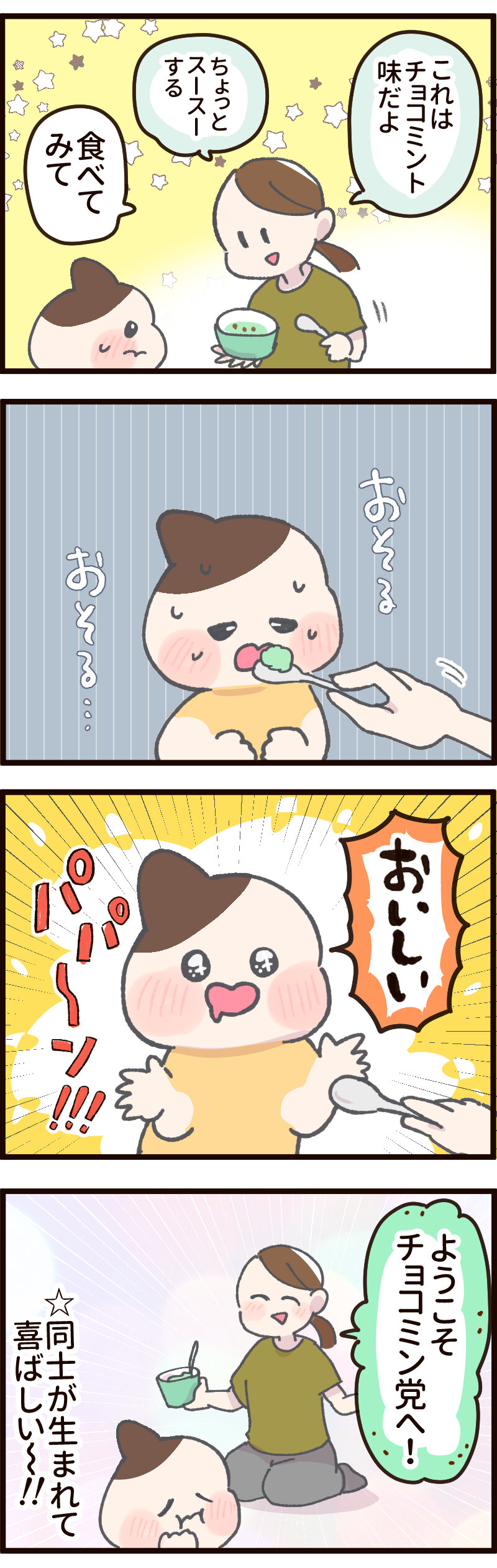 4歳はチョコミントが好きなのか? 2024.07.03 日常 4歳はチョコミントが好きなのか? あとがき やっぱり自分が好きなものを 好きだと言ってもらえるのは とてもうれしい! 夫が体に良い食事を考えた結果… アイスがもれてきた!4歳の反応 4歳にもばかうけのお菓子 これでたくさんチョコミントを備えられるぜ…! 0 コメントはこちら 同じカテゴリの記事 ワンテンポ遅い親の気付き おしっこもってくの!? パパのアドバイスを受け止める 連載一覧 寒さ対策 不審者にならないために 赤ちゃんがうなる理由 インフルエンザの予防接種に行ってきた! 5歳の娘の不思議な質問!?【ASOPPA!連載】 毎年恒例のおせちの選び方! 雨の日にお外に行ってはいけないよ 臓器なのにかわいい? 子どもの心臓の音を聞いて親が気づいた大切なこと【ASOPPA!連載】 ヤマトじゃない 夫が北海道に行くらしい 撮ってると思って身構えたのに……主役はまさかの“そっち側”だった【ASOPPA!連載】 初めてのたこ焼き作るよ!【後編】 初めてのたこ焼き作るよ!【前編】 9月になったので年末の準備をはじめる! 園で拾ったピンクの石を交換した娘……ほっこりする話かと思いきや、まさかの展開に母ダッシュ【ASOPPA!連載】 LINEスタンプ、配信開始しました! 自信満々な5さい 祭りの花火、音と煙で怖いかな?泣いちゃうかな……!?【ASOPPA!連載】 「乗ってもいいの?」遠慮する5歳を飛行機ポーズで飛ばしてみたら…【ASOPPA!連載】 おしゃれな本棚を作りたい! ママみて!が止まらない 大人がうんていにチャレンジしたら、肩からすごい音が…【ASOPPA!連載】 たかた、全集中〇〇の型 お菓子警察、もう騙されない ママって魔法使い!?ペットボトルを使った水あそびでサイエンスごっこ【ASOPPA!連載】 セルフまつパにチャレンジしてみた話 ランドセルの話をしてただけなのに……先生の声が少し変わった瞬間のこと【ASOPPA!連載】とお知らせ なんにでも才能を見出しちゃう親 ママのヒントがまさかの罠!?しりとり中に飛び出した言い間違いに思わずにっこり【ASOPPA!連載】 無意識に自分を下げてしまうことがある かわいいすぎてずるいって話と書籍PR 星がふえると、なんだかうれしい!七夕の“飛ばし絵”あそび【ASOPPA!連載】 5さい、指先の皮がボロボロ… からあげってどんな味がする!? 君が生まれたばかりの世界は……5歳の誕生日に感じた子どもの成長【ASOPPA!連載】 わずかなヒントから答えを探し出せ! カレーうどんってどんな味?5歳の素直な感想にパパ思わず感心【ASOPPA!連載】 ダメージ加工ってさ… 「1たす1は11?」5歳児のピュアな計算ミスに母、胸キュン【ASOPPA!連載】 記念すべき?歯が抜けた話【後編】 記念すべき?歯が抜けた話【中編】 記念すべき?歯が抜けた話【前編】 各方面への配慮 懐かしくて、ちょっとしょっぱい。大人になって気づいた、駄菓子とのちょうどいい距離感【ASOPPA!連載】 緊張しいのたかた【後編】七五三の前撮り 緊張しいのたかた【前編】七五三の前撮り ここまでくるのに5年かかりました 生放送でお名前を呼ばれたい 泥団子を極めしもの ピーピー豆とおままごと 「パパだけ保育園に行くね」と言ったら、娘の返答がまさかの本気モードで笑っちゃう!【ASOPPA!連載】 見せたい自信作 ねぇ、あれってなんだっけ? ドレスを選ぶ基準【後編】七五三の前撮り ドレスを選ぶ基準【前編】七五三の前撮り 泣くのって悪いこと?【後編】 泣くのって悪いこと?【前編】 ありがとうじゃなくて……!?5歳にお礼を促した結果に笑っちゃう【ASOPPA!連載】 もう七五三するの!?【後編】 もう七五三するの!?【前編】 パパのおしり拭き おいしいお薬を食べてみた 君が赤ちゃんのときの話 一体何を見つけたの〜!?子どもと過ごす春は発見とハプニングの連続だ!【ASOPPA!連載】 ゆふいんの森号に乗りたい親子 2025春のパン祭り経過 冷蔵庫にゼリーがあるぞ! 「せ」の音はどこ?ピアノで遊ぶ4歳の純粋な疑問にパパ困惑 【ASOPPA!連載】 アマゾンってなに? タブレットに不正アクセスされた話 そろそろ「たかた」を卒業させたい 「まごわやさしい」の「い」はまさかの……!?4歳の自由すぎる発想に思わず笑顔に【ASOPPA!連載】 名前の練習ってどうする?我が家のゆるっと入園準備 【ASOPPA!連載】 ついにこの時がやってきた オンラインフィットネス「サーティフィット」で理想の体を目指す話④ ご報告 私もかわいいの!赤ちゃん時代の写真を見た4歳児の反応にほっこり【ASOPPA!連載】 今年もパン祭りがはじまった お散歩が楽しみすぎる4歳!着替えながらお片付け……できちゃうの!?【ASOPPA!連載】 4歳、歯科がこわい ほぼ売れ切れのご飯屋さんの正体 いつものおやつを特別にする?とびきりの裏技 かわいい4歳の指を借りて……バレンタインのかわいいお菓子を一緒に手作り【ASOPPA!連載】 オンラインフィットネス「サーティフィット」で理想の体を目指す話③ 断られても気にしないメンタル 疲れた母をどうにかする4才 手に余ったクリームを… 体調が悪くなると変な想像するよね? 2025年節分 我が家にあ