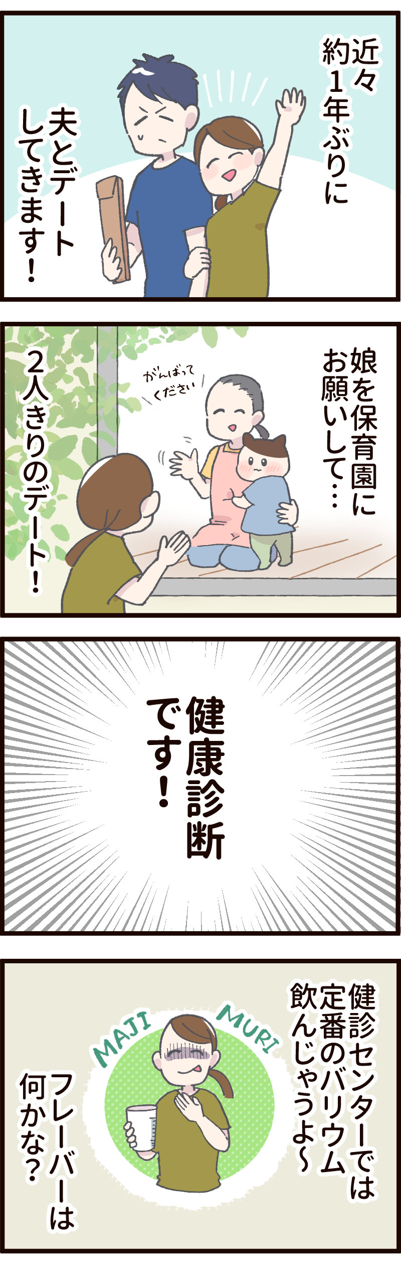 久しぶりに夫と2人きりのデート! 2024.07.04 日常 久しぶりに夫と2人きりのデート! あとがき バリウム飲むと 吐き気が止まらなくなるから 本当に飲みたくない… 夫のバリウムへの想い ありのままの私【風邪⑫】 納豆が健康にいいと聞いて 数日前からずっと憂鬱でいる…こんなん全然デートじゃない夫にとっては介護だよ 0 コメントはこちら 同じカテゴリの記事 ワンテンポ遅い親の気付き おしっこもってくの!? パパのアドバイスを受け止める 連載一覧 寒さ対策 不審者にならないために 赤ちゃんがうなる理由 インフルエンザの予防接種に行ってきた! 5歳の娘の不思議な質問!?【ASOPPA!連載】 毎年恒例のおせちの選び方! 雨の日にお外に行ってはいけないよ 臓器なのにかわいい? 子どもの心臓の音を聞いて親が気づいた大切なこと【ASOPPA!連載】 ヤマトじゃない 夫が北海道に行くらしい 撮ってると思って身構えたのに……主役はまさかの“そっち側”だった【ASOPPA!連載】 初めてのたこ焼き作るよ!【後編】 初めてのたこ焼き作るよ!【前編】 9月になったので年末の準備をはじめる! 園で拾ったピンクの石を交換した娘……ほっこりする話かと思いきや、まさかの展開に母ダッシュ【ASOPPA!連載】 LINEスタンプ、配信開始しました! 自信満々な5さい 祭りの花火、音と煙で怖いかな?泣いちゃうかな……!?【ASOPPA!連載】 「乗ってもいいの?」遠慮する5歳を飛行機ポーズで飛ばしてみたら…【ASOPPA!連載】 おしゃれな本棚を作りたい! ママみて!が止まらない 大人がうんていにチャレンジしたら、肩からすごい音が…【ASOPPA!連載】 たかた、全集中〇〇の型 お菓子警察、もう騙されない ママって魔法使い!?ペットボトルを使った水あそびでサイエンスごっこ【ASOPPA!連載】 セルフまつパにチャレンジしてみた話 ランドセルの話をしてただけなのに……先生の声が少し変わった瞬間のこと【ASOPPA!連載】とお知らせ なんにでも才能を見出しちゃう親 ママのヒントがまさかの罠!?しりとり中に飛び出した言い間違いに思わずにっこり【ASOPPA!連載】 無意識に自分を下げてしまうことがある かわいいすぎてずるいって話と書籍PR 星がふえると、なんだかうれしい!七夕の“飛ばし絵”あそび【ASOPPA!連載】 5さい、指先の皮がボロボロ… からあげってどんな味がする!? 君が生まれたばかりの世界は……5歳の誕生日に感じた子どもの成長【ASOPPA!連載】 わずかなヒントから答えを探し出せ! カレーうどんってどんな味?5歳の素直な感想にパパ思わず感心【ASOPPA!連載】 ダメージ加工ってさ… 「1たす1は11?」5歳児のピュアな計算ミスに母、胸キュン【ASOPPA!連載】 記念すべき?歯が抜けた話【後編】 記念すべき?歯が抜けた話【中編】 記念すべき?歯が抜けた話【前編】 各方面への配慮 懐かしくて、ちょっとしょっぱい。大人になって気づいた、駄菓子とのちょうどいい距離感【ASOPPA!連載】 緊張しいのたかた【後編】七五三の前撮り 緊張しいのたかた【前編】七五三の前撮り ここまでくるのに5年かかりました 生放送でお名前を呼ばれたい 泥団子を極めしもの ピーピー豆とおままごと 「パパだけ保育園に行くね」と言ったら、娘の返答がまさかの本気モードで笑っちゃう!【ASOPPA!連載】 見せたい自信作 ねぇ、あれってなんだっけ? ドレスを選ぶ基準【後編】七五三の前撮り ドレスを選ぶ基準【前編】七五三の前撮り 泣くのって悪いこと?【後編】 泣くのって悪いこと?【前編】 ありがとうじゃなくて……!?5歳にお礼を促した結果に笑っちゃう【ASOPPA!連載】 もう七五三するの!?【後編】 もう七五三するの!?【前編】 パパのおしり拭き おいしいお薬を食べてみた 君が赤ちゃんのときの話 一体何を見つけたの〜!?子どもと過ごす春は発見とハプニングの連続だ!【ASOPPA!連載】 ゆふいんの森号に乗りたい親子 2025春のパン祭り経過 冷蔵庫にゼリーがあるぞ! 「せ」の音はどこ?ピアノで遊ぶ4歳の純粋な疑問にパパ困惑 【ASOPPA!連載】 アマゾンってなに? タブレットに不正アクセスされた話 そろそろ「たかた」を卒業させたい 「まごわやさしい」の「い」はまさかの……!?4歳の自由すぎる発想に思わず笑顔に【ASOPPA!連載】 名前の練習ってどうする?我が家のゆるっと入園準備 【ASOPPA!連載】 ついにこの時がやってきた オンラインフィットネス「サーティフィット」で理想の体を目指す話④ ご報告 私もかわいいの!赤ちゃん時代の写真を見た4歳児の反応にほっこり【ASOPPA!連載】 今年もパン祭りがはじまった お散歩が楽しみすぎる4歳!着替えながらお片付け……できちゃうの!?【ASOPPA!連載】 4歳、歯科がこわい ほぼ売れ切れのご飯屋さんの正体 いつものおやつを特別にする?とびきりの裏技 かわいい4歳の指を借りて……バレンタインのかわいいお菓子を一緒に手作り【ASOPPA!連載】 オンラインフィットネス「サーティフィット」で理想の体を目指す話③ 断られても気にしないメンタル 疲れた母をどうにかする4才 手に余ったクリームを… 体調が悪くなると変な想像するよね? 2025年節