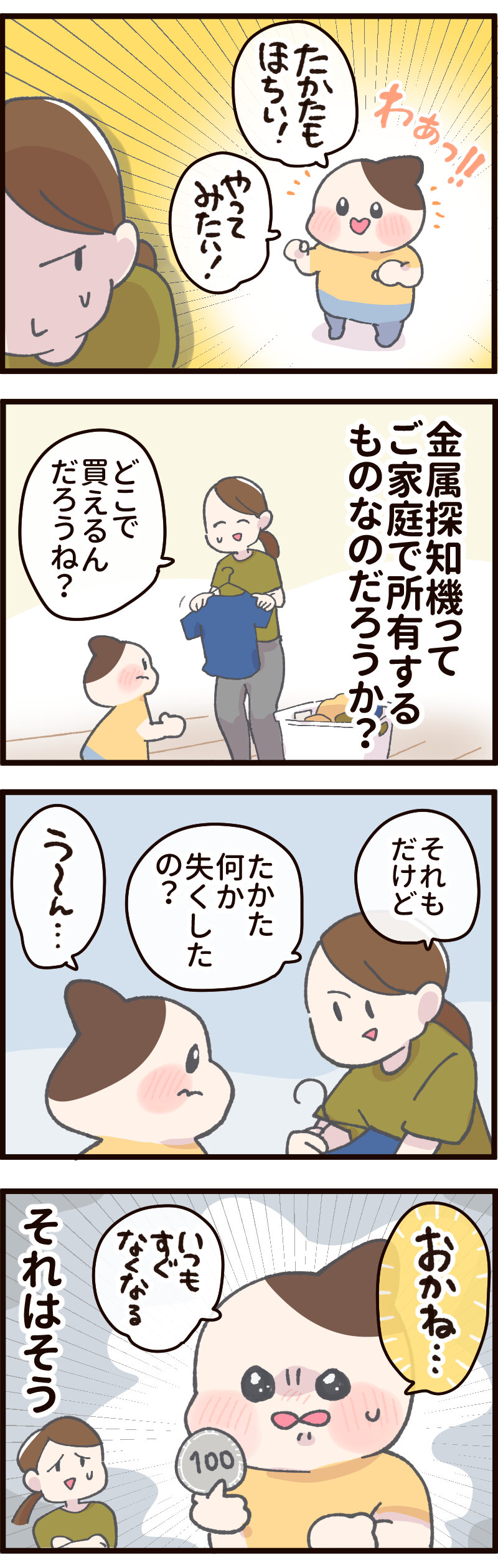 たんきちってしってる? 2024.07.12 日常 たんきちってしってる? あとがき ちなみに金属探知機はAmazonで買えそうです 【正規輸入品】アメリカ製 トレジャーハンター VLF 高性能金属探知機 ご家庭用もあるようだけどイメージとしてはこれかなぁ… ご家庭用は釣り針を探すのにいいみたいなるほどね〜! でも多分、なくした(?)お金はきっと探しても見つからないと思うガチャガチャに使っちゃったからね😂 0 コメントはこちら 同じカテゴリの記事 ワンテンポ遅い親の気付き おしっこもってくの!? パパのアドバイスを受け止める 連載一覧 寒さ対策 不審者にならないために 赤ちゃんがうなる理由 インフルエンザの予防接種に行ってきた! 5歳の娘の不思議な質問!?【ASOPPA!連載】 毎年恒例のおせちの選び方! 雨の日にお外に行ってはいけないよ 臓器なのにかわいい? 子どもの心臓の音を聞いて親が気づいた大切なこと【ASOPPA!連載】 ヤマトじゃない 夫が北海道に行くらしい 撮ってると思って身構えたのに……主役はまさかの“そっち側”だった【ASOPPA!連載】 初めてのたこ焼き作るよ!【後編】 初めてのたこ焼き作るよ!【前編】 9月になったので年末の準備をはじめる! 園で拾ったピンクの石を交換した娘……ほっこりする話かと思いきや、まさかの展開に母ダッシュ【ASOPPA!連載】 LINEスタンプ、配信開始しました! 自信満々な5さい 祭りの花火、音と煙で怖いかな?泣いちゃうかな……!?【ASOPPA!連載】 「乗ってもいいの?」遠慮する5歳を飛行機ポーズで飛ばしてみたら…【ASOPPA!連載】 おしゃれな本棚を作りたい! ママみて!が止まらない 大人がうんていにチャレンジしたら、肩からすごい音が…【ASOPPA!連載】 たかた、全集中〇〇の型 お菓子警察、もう騙されない ママって魔法使い!?ペットボトルを使った水あそびでサイエンスごっこ【ASOPPA!連載】 セルフまつパにチャレンジしてみた話 ランドセルの話をしてただけなのに……先生の声が少し変わった瞬間のこと【ASOPPA!連載】とお知らせ なんにでも才能を見出しちゃう親 ママのヒントがまさかの罠!?しりとり中に飛び出した言い間違いに思わずにっこり【ASOPPA!連載】 無意識に自分を下げてしまうことがある かわいいすぎてずるいって話と書籍PR 星がふえると、なんだかうれしい!七夕の“飛ばし絵”あそび【ASOPPA!連載】 5さい、指先の皮がボロボロ… からあげってどんな味がする!? 君が生まれたばかりの世界は……5歳の誕生日に感じた子どもの成長【ASOPPA!連載】 わずかなヒントから答えを探し出せ! カレーうどんってどんな味?5歳の素直な感想にパパ思わず感心【ASOPPA!連載】 ダメージ加工ってさ… 「1たす1は11?」5歳児のピュアな計算ミスに母、胸キュン【ASOPPA!連載】 記念すべき?歯が抜けた話【後編】 記念すべき?歯が抜けた話【中編】 記念すべき?歯が抜けた話【前編】 各方面への配慮 懐かしくて、ちょっとしょっぱい。大人になって気づいた、駄菓子とのちょうどいい距離感【ASOPPA!連載】 緊張しいのたかた【後編】七五三の前撮り 緊張しいのたかた【前編】七五三の前撮り ここまでくるのに5年かかりました 生放送でお名前を呼ばれたい 泥団子を極めしもの ピーピー豆とおままごと 「パパだけ保育園に行くね」と言ったら、娘の返答がまさかの本気モードで笑っちゃう!【ASOPPA!連載】 見せたい自信作 ねぇ、あれってなんだっけ? ドレスを選ぶ基準【後編】七五三の前撮り ドレスを選ぶ基準【前編】七五三の前撮り 泣くのって悪いこと?【後編】 泣くのって悪いこと?【前編】 ありがとうじゃなくて……!?5歳にお礼を促した結果に笑っちゃう【ASOPPA!連載】 もう七五三するの!?【後編】 もう七五三するの!?【前編】 パパのおしり拭き おいしいお薬を食べてみた 君が赤ちゃんのときの話 一体何を見つけたの〜!?子どもと過ごす春は発見とハプニングの連続だ!【ASOPPA!連載】 ゆふいんの森号に乗りたい親子 2025春のパン祭り経過 冷蔵庫にゼリーがあるぞ! 「せ」の音はどこ?ピアノで遊ぶ4歳の純粋な疑問にパパ困惑 【ASOPPA!連載】 アマゾンってなに? タブレットに不正アクセスされた話 そろそろ「たかた」を卒業させたい 「まごわやさしい」の「い」はまさかの……!?4歳の自由すぎる発想に思わず笑顔に【ASOPPA!連載】 名前の練習ってどうする?我が家のゆるっと入園準備 【ASOPPA!連載】 ついにこの時がやってきた オンラインフィットネス「サーティフィット」で理想の体を目指す話④ ご報告 私もかわいいの!赤ちゃん時代の写真を見た4歳児の反応にほっこり【ASOPPA!連載】 今年もパン祭りがはじまった お散歩が楽しみすぎる4歳!着替えながらお片付け……できちゃうの!?【ASOPPA!連載】 4歳、歯科がこわい ほぼ売れ切れのご飯屋さんの正体 いつものおやつを特別にする?とびきりの裏技 かわいい4歳の指を借りて……バレンタインのかわいいお菓子を一緒に手作り【ASOPPA!連載】 オンラインフィットネス「サーティフィット」で理想の体を目指す話③ 断られても気にしないメンタル 疲れた母をどうに