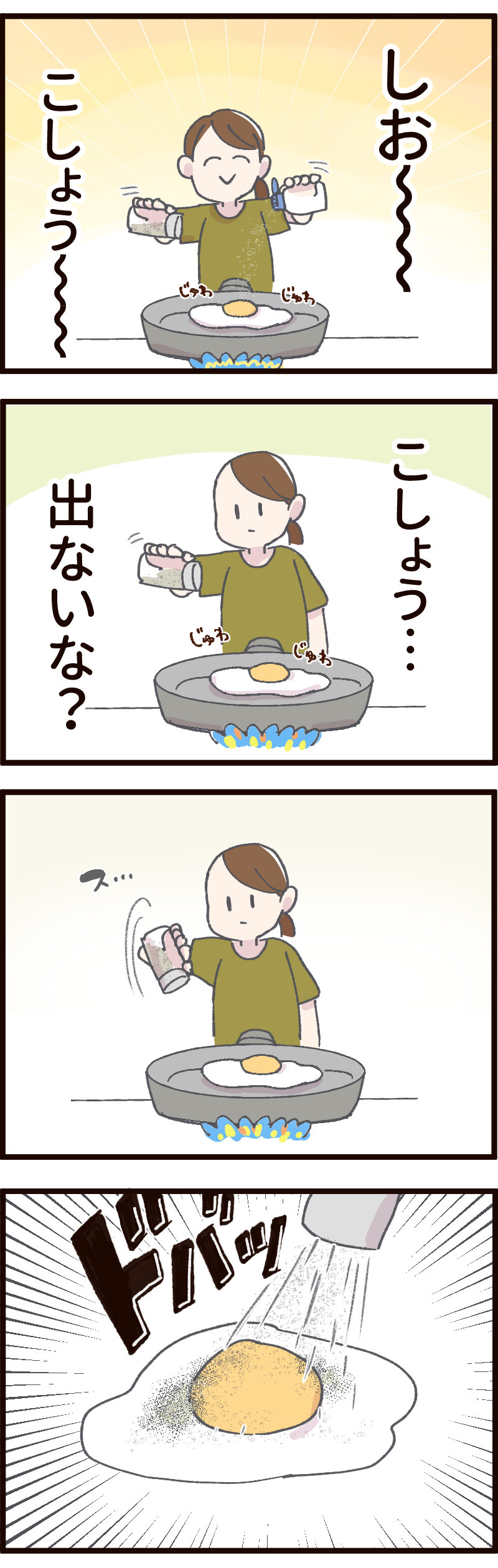 こしょうがなかなか出てこない 2024.07.31 日常 こしょうがなかなか出てこない なぜ逆さまにした? あとがき 一瞬のうちに白身に吸収されてしまう! 結局、そのまま食べた からかった…かなしみ🥲 リベンジホットケーキ 消えるティッシュ ドウシテ…ドウシテ…… あまりにも愚かだと思ったから 漫画にせずにはいられなかったけど どうして漫画にしちゃったんだろう… せめて笑って! 0 コメントはこちら 同じカテゴリの記事 ワンテンポ遅い親の気付き おしっこもってくの!? パパのアドバイスを受け止める 連載一覧 寒さ対策 不審者にならないために 赤ちゃんがうなる理由 インフルエンザの予防接種に行ってきた! 5歳の娘の不思議な質問!?【ASOPPA!連載】 毎年恒例のおせちの選び方! 雨の日にお外に行ってはいけないよ 臓器なのにかわいい? 子どもの心臓の音を聞いて親が気づいた大切なこと【ASOPPA!連載】 ヤマトじゃない 夫が北海道に行くらしい 撮ってると思って身構えたのに……主役はまさかの“そっち側”だった【ASOPPA!連載】 初めてのたこ焼き作るよ!【後編】 初めてのたこ焼き作るよ!【前編】 9月になったので年末の準備をはじめる! 園で拾ったピンクの石を交換した娘……ほっこりする話かと思いきや、まさかの展開に母ダッシュ【ASOPPA!連載】 LINEスタンプ、配信開始しました! 自信満々な5さい 祭りの花火、音と煙で怖いかな?泣いちゃうかな……!?【ASOPPA!連載】 「乗ってもいいの?」遠慮する5歳を飛行機ポーズで飛ばしてみたら…【ASOPPA!連載】 おしゃれな本棚を作りたい! ママみて!が止まらない 大人がうんていにチャレンジしたら、肩からすごい音が…【ASOPPA!連載】 たかた、全集中〇〇の型 お菓子警察、もう騙されない ママって魔法使い!?ペットボトルを使った水あそびでサイエンスごっこ【ASOPPA!連載】 セルフまつパにチャレンジしてみた話 ランドセルの話をしてただけなのに……先生の声が少し変わった瞬間のこと【ASOPPA!連載】とお知らせ なんにでも才能を見出しちゃう親 ママのヒントがまさかの罠!?しりとり中に飛び出した言い間違いに思わずにっこり【ASOPPA!連載】 無意識に自分を下げてしまうことがある かわいいすぎてずるいって話と書籍PR 星がふえると、なんだかうれしい!七夕の“飛ばし絵”あそび【ASOPPA!連載】 5さい、指先の皮がボロボロ… からあげってどんな味がする!? 君が生まれたばかりの世界は……5歳の誕生日に感じた子どもの成長【ASOPPA!連載】 わずかなヒントから答えを探し出せ! カレーうどんってどんな味?5歳の素直な感想にパパ思わず感心【ASOPPA!連載】 ダメージ加工ってさ… 「1たす1は11?」5歳児のピュアな計算ミスに母、胸キュン【ASOPPA!連載】 記念すべき?歯が抜けた話【後編】 記念すべき?歯が抜けた話【中編】 記念すべき?歯が抜けた話【前編】 各方面への配慮 懐かしくて、ちょっとしょっぱい。大人になって気づいた、駄菓子とのちょうどいい距離感【ASOPPA!連載】 緊張しいのたかた【後編】七五三の前撮り 緊張しいのたかた【前編】七五三の前撮り ここまでくるのに5年かかりました 生放送でお名前を呼ばれたい 泥団子を極めしもの ピーピー豆とおままごと 「パパだけ保育園に行くね」と言ったら、娘の返答がまさかの本気モードで笑っちゃう!【ASOPPA!連載】 見せたい自信作 ねぇ、あれってなんだっけ? ドレスを選ぶ基準【後編】七五三の前撮り ドレスを選ぶ基準【前編】七五三の前撮り 泣くのって悪いこと?【後編】 泣くのって悪いこと?【前編】 ありがとうじゃなくて……!?5歳にお礼を促した結果に笑っちゃう【ASOPPA!連載】 もう七五三するの!?【後編】 もう七五三するの!?【前編】 パパのおしり拭き おいしいお薬を食べてみた 君が赤ちゃんのときの話 一体何を見つけたの〜!?子どもと過ごす春は発見とハプニングの連続だ!【ASOPPA!連載】 ゆふいんの森号に乗りたい親子 2025春のパン祭り経過 冷蔵庫にゼリーがあるぞ! 「せ」の音はどこ?ピアノで遊ぶ4歳の純粋な疑問にパパ困惑 【ASOPPA!連載】 アマゾンってなに? タブレットに不正アクセスされた話 そろそろ「たかた」を卒業させたい 「まごわやさしい」の「い」はまさかの……!?4歳の自由すぎる発想に思わず笑顔に【ASOPPA!連載】 名前の練習ってどうする?我が家のゆるっと入園準備 【ASOPPA!連載】 ついにこの時がやってきた オンラインフィットネス「サーティフィット」で理想の体を目指す話④ ご報告 私もかわいいの!赤ちゃん時代の写真を見た4歳児の反応にほっこり【ASOPPA!連載】 今年もパン祭りがはじまった お散歩が楽しみすぎる4歳!着替えながらお片付け……できちゃうの!?【ASOPPA!連載】 4歳、歯科がこわい ほぼ売れ切れのご飯屋さんの正体 いつものおやつを特別にする?とびきりの裏技 かわいい4歳の指を借りて……バレンタインのかわいいお菓子を一緒に手作り【ASOPPA!連載】 オンラインフィットネス「サーティフィット」で理想の体を目指す話③ 断られても気にしないメンタル 疲れた母をどうにかする4才 手に余