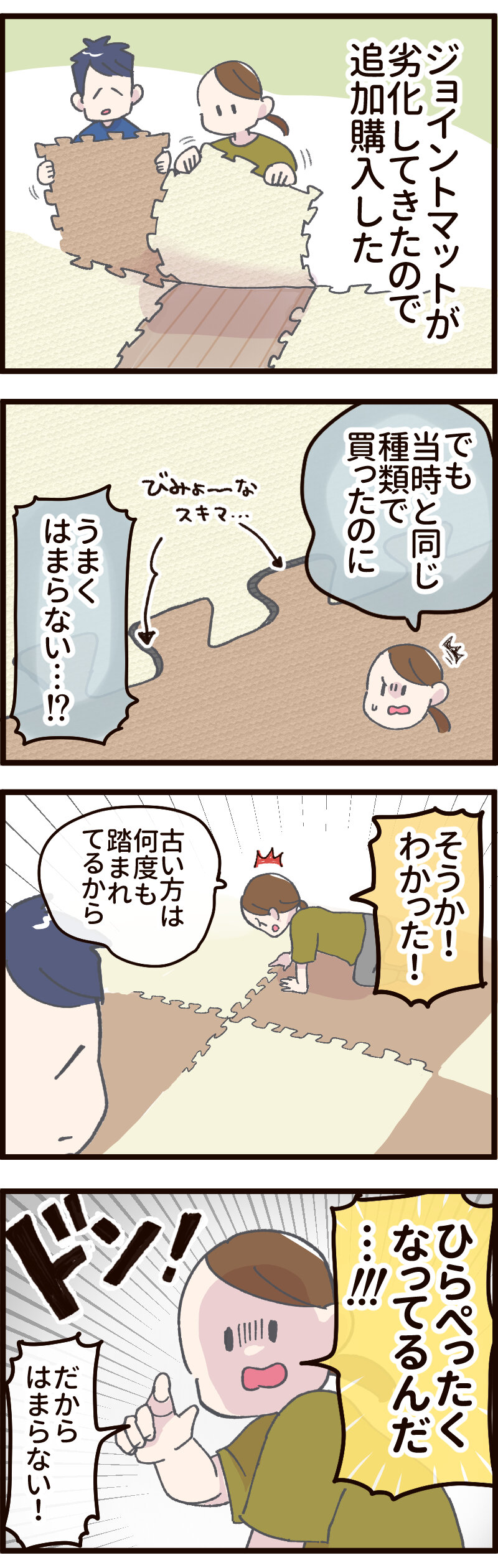 ジョイントマット買い替えで、まさかの発覚 2024.08.21 日常 ジョイントマット買い替えで、まさかの発覚 あとがき ひらぺったい…ではない…!!!? ジョイントマットの思い出 ラグを敷きたいけど、子どもが汚すのが気になる…どうする? 大掃除してると、米粒と砂がいっぱい出てくるんだが… ▼LINEスタンプ発売中です 良かったら使ってね〜🌼 エブリディたかた‐LINEスタンプ 方言か…!?とも思ったけど そういう訳でもなさそう それはそれとしてジョイントマット、 まさかの追加購入しました。 全面剥がすこともも考えたけど、 やっぱり子どもが床に物を落とすことも多いし、 床をなるべく守りたいので継続します。 新しいジョイントマットは 古いものと比べてフカフカしてます。 足に優しくていいよ…! 0 コメントはこちら 同じカテゴリの記事 ワンテンポ遅い親の気付き おしっこもってくの!? パパのアドバイスを受け止める 連載一覧 寒さ対策 不審者にならないために 赤ちゃんがうなる理由 インフルエンザの予防接種に行ってきた! 5歳の娘の不思議な質問!?【ASOPPA!連載】 毎年恒例のおせちの選び方! 雨の日にお外に行ってはいけないよ 臓器なのにかわいい? 子どもの心臓の音を聞いて親が気づいた大切なこと【ASOPPA!連載】 ヤマトじゃない 夫が北海道に行くらしい 撮ってると思って身構えたのに……主役はまさかの“そっち側”だった【ASOPPA!連載】 初めてのたこ焼き作るよ!【後編】 初めてのたこ焼き作るよ!【前編】 9月になったので年末の準備をはじめる! 園で拾ったピンクの石を交換した娘……ほっこりする話かと思いきや、まさかの展開に母ダッシュ【ASOPPA!連載】 LINEスタンプ、配信開始しました! 自信満々な5さい 祭りの花火、音と煙で怖いかな?泣いちゃうかな……!?【ASOPPA!連載】 「乗ってもいいの?」遠慮する5歳を飛行機ポーズで飛ばしてみたら…【ASOPPA!連載】 おしゃれな本棚を作りたい! ママみて!が止まらない 大人がうんていにチャレンジしたら、肩からすごい音が…【ASOPPA!連載】 たかた、全集中〇〇の型 お菓子警察、もう騙されない ママって魔法使い!?ペットボトルを使った水あそびでサイエンスごっこ【ASOPPA!連載】 セルフまつパにチャレンジしてみた話 ランドセルの話をしてただけなのに……先生の声が少し変わった瞬間のこと【ASOPPA!連載】とお知らせ なんにでも才能を見出しちゃう親 ママのヒントがまさかの罠!?しりとり中に飛び出した言い間違いに思わずにっこり【ASOPPA!連載】 無意識に自分を下げてしまうことがある かわいいすぎてずるいって話と書籍PR 星がふえると、なんだかうれしい!七夕の“飛ばし絵”あそび【ASOPPA!連載】 5さい、指先の皮がボロボロ… からあげってどんな味がする!? 君が生まれたばかりの世界は……5歳の誕生日に感じた子どもの成長【ASOPPA!連載】 わずかなヒントから答えを探し出せ! カレーうどんってどんな味?5歳の素直な感想にパパ思わず感心【ASOPPA!連載】 ダメージ加工ってさ… 「1たす1は11?」5歳児のピュアな計算ミスに母、胸キュン【ASOPPA!連載】 記念すべき?歯が抜けた話【後編】 記念すべき?歯が抜けた話【中編】 記念すべき?歯が抜けた話【前編】 各方面への配慮 懐かしくて、ちょっとしょっぱい。大人になって気づいた、駄菓子とのちょうどいい距離感【ASOPPA!連載】 緊張しいのたかた【後編】七五三の前撮り 緊張しいのたかた【前編】七五三の前撮り ここまでくるのに5年かかりました 生放送でお名前を呼ばれたい 泥団子を極めしもの ピーピー豆とおままごと 「パパだけ保育園に行くね」と言ったら、娘の返答がまさかの本気モードで笑っちゃう!【ASOPPA!連載】 見せたい自信作 ねぇ、あれってなんだっけ? ドレスを選ぶ基準【後編】七五三の前撮り ドレスを選ぶ基準【前編】七五三の前撮り 泣くのって悪いこと?【後編】 泣くのって悪いこと?【前編】 ありがとうじゃなくて……!?5歳にお礼を促した結果に笑っちゃう【ASOPPA!連載】 もう七五三するの!?【後編】 もう七五三するの!?【前編】 パパのおしり拭き おいしいお薬を食べてみた 君が赤ちゃんのときの話 一体何を見つけたの〜!?子どもと過ごす春は発見とハプニングの連続だ!【ASOPPA!連載】 ゆふいんの森号に乗りたい親子 2025春のパン祭り経過 冷蔵庫にゼリーがあるぞ! 「せ」の音はどこ?ピアノで遊ぶ4歳の純粋な疑問にパパ困惑 【ASOPPA!連載】 アマゾンってなに? タブレットに不正アクセスされた話 そろそろ「たかた」を卒業させたい 「まごわやさしい」の「い」はまさかの……!?4歳の自由すぎる発想に思わず笑顔に【ASOPPA!連載】 名前の練習ってどうする?我が家のゆるっと入園準備 【ASOPPA!連載】 ついにこの時がやってきた オンラインフィットネス「サーティフィット」で理想の体を目指す話④ ご報告 私もかわいいの!赤ちゃん時代の写真を見た4歳児の反応にほっこり【ASOPPA!連載】 今年もパン祭りがはじまった お散歩が楽しみすぎる4歳!着替えながらお片付け……できちゃうの!?【ASOPPA!連載】 4歳