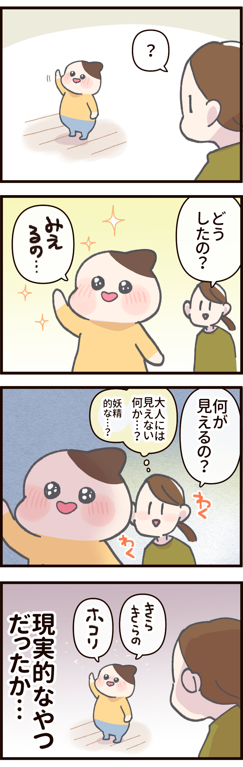 何もない空間に手を伸ばす子ども… 2024.10.27 日常 何もない空間に手を伸ばす子ども… あとがき 光の角度で見えるやつだったわ… お掃除よんしゃい 見える…見えるぞ…!!! ラグを敷きたいけど、子どもが汚すのが気になる…どうする? 子どもにしか見えない まっくろくろすけ的なものを 期待していたんだけど いや、ある意味 まっくろくろすけ的なもの …ではあるかもしれない…??? 0 コメントはこちら 同じカテゴリの記事 ワンテンポ遅い親の気付き おしっこもってくの!? パパのアドバイスを受け止める 連載一覧 寒さ対策 不審者にならないために 赤ちゃんがうなる理由 インフルエンザの予防接種に行ってきた! 5歳の娘の不思議な質問!?【ASOPPA!連載】 毎年恒例のおせちの選び方! 雨の日にお外に行ってはいけないよ 臓器なのにかわいい? 子どもの心臓の音を聞いて親が気づいた大切なこと【ASOPPA!連載】 ヤマトじゃない 夫が北海道に行くらしい 撮ってると思って身構えたのに……主役はまさかの“そっち側”だった【ASOPPA!連載】 初めてのたこ焼き作るよ!【後編】 初めてのたこ焼き作るよ!【前編】 9月になったので年末の準備をはじめる! 園で拾ったピンクの石を交換した娘……ほっこりする話かと思いきや、まさかの展開に母ダッシュ【ASOPPA!連載】 LINEスタンプ、配信開始しました! 自信満々な5さい 祭りの花火、音と煙で怖いかな?泣いちゃうかな……!?【ASOPPA!連載】 「乗ってもいいの?」遠慮する5歳を飛行機ポーズで飛ばしてみたら…【ASOPPA!連載】 おしゃれな本棚を作りたい! ママみて!が止まらない 大人がうんていにチャレンジしたら、肩からすごい音が…【ASOPPA!連載】 たかた、全集中〇〇の型 お菓子警察、もう騙されない ママって魔法使い!?ペットボトルを使った水あそびでサイエンスごっこ【ASOPPA!連載】 セルフまつパにチャレンジしてみた話 ランドセルの話をしてただけなのに……先生の声が少し変わった瞬間のこと【ASOPPA!連載】とお知らせ なんにでも才能を見出しちゃう親 ママのヒントがまさかの罠!?しりとり中に飛び出した言い間違いに思わずにっこり【ASOPPA!連載】 無意識に自分を下げてしまうことがある かわいいすぎてずるいって話と書籍PR 星がふえると、なんだかうれしい!七夕の“飛ばし絵”あそび【ASOPPA!連載】 5さい、指先の皮がボロボロ… からあげってどんな味がする!? 君が生まれたばかりの世界は……5歳の誕生日に感じた子どもの成長【ASOPPA!連載】 わずかなヒントから答えを探し出せ! カレーうどんってどんな味?5歳の素直な感想にパパ思わず感心【ASOPPA!連載】 ダメージ加工ってさ… 「1たす1は11?」5歳児のピュアな計算ミスに母、胸キュン【ASOPPA!連載】 記念すべき?歯が抜けた話【後編】 記念すべき?歯が抜けた話【中編】 記念すべき?歯が抜けた話【前編】 各方面への配慮 懐かしくて、ちょっとしょっぱい。大人になって気づいた、駄菓子とのちょうどいい距離感【ASOPPA!連載】 緊張しいのたかた【後編】七五三の前撮り 緊張しいのたかた【前編】七五三の前撮り ここまでくるのに5年かかりました 生放送でお名前を呼ばれたい 泥団子を極めしもの ピーピー豆とおままごと 「パパだけ保育園に行くね」と言ったら、娘の返答がまさかの本気モードで笑っちゃう!【ASOPPA!連載】 見せたい自信作 ねぇ、あれってなんだっけ? ドレスを選ぶ基準【後編】七五三の前撮り ドレスを選ぶ基準【前編】七五三の前撮り 泣くのって悪いこと?【後編】 泣くのって悪いこと?【前編】 ありがとうじゃなくて……!?5歳にお礼を促した結果に笑っちゃう【ASOPPA!連載】 もう七五三するの!?【後編】 もう七五三するの!?【前編】 パパのおしり拭き おいしいお薬を食べてみた 君が赤ちゃんのときの話 一体何を見つけたの〜!?子どもと過ごす春は発見とハプニングの連続だ!【ASOPPA!連載】 ゆふいんの森号に乗りたい親子 2025春のパン祭り経過 冷蔵庫にゼリーがあるぞ! 「せ」の音はどこ?ピアノで遊ぶ4歳の純粋な疑問にパパ困惑 【ASOPPA!連載】 アマゾンってなに? タブレットに不正アクセスされた話 そろそろ「たかた」を卒業させたい 「まごわやさしい」の「い」はまさかの……!?4歳の自由すぎる発想に思わず笑顔に【ASOPPA!連載】 名前の練習ってどうする?我が家のゆるっと入園準備 【ASOPPA!連載】 ついにこの時がやってきた オンラインフィットネス「サーティフィット」で理想の体を目指す話④ ご報告 私もかわいいの!赤ちゃん時代の写真を見た4歳児の反応にほっこり【ASOPPA!連載】 今年もパン祭りがはじまった お散歩が楽しみすぎる4歳!着替えながらお片付け……できちゃうの!?【ASOPPA!連載】 4歳、歯科がこわい ほぼ売れ切れのご飯屋さんの正体 いつものおやつを特別にする?とびきりの裏技 かわいい4歳の指を借りて……バレンタインのかわいいお菓子を一緒に手作り【ASOPPA!連載】 オンラインフィットネス「サーティフィット」で理想の体を目指す話③ 断られても気にしないメンタル 疲れた母をどうにかする4才 手に余