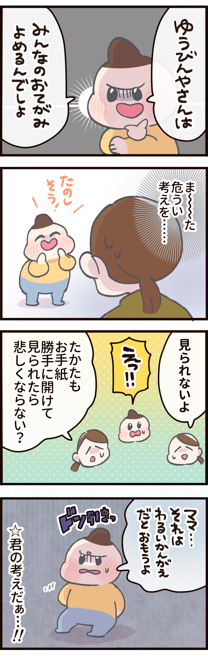 「ゆうびんやさんは、みんなのおてがみよめるんでしょ?」と